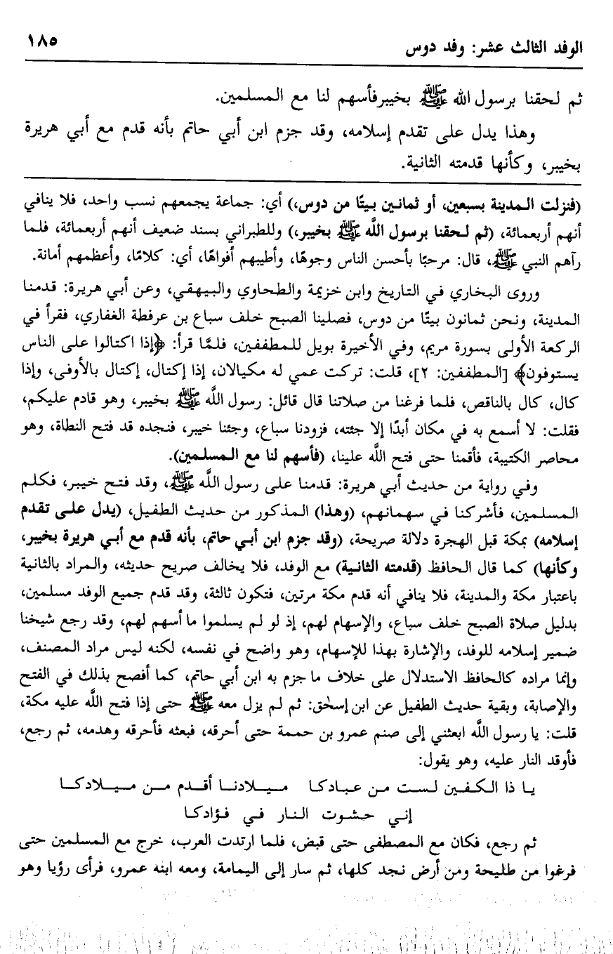 وروى البخاري في التاريخ وابن خزيمة والطحاوي والبيهقي، وعن أبي هريرة: قدمنا المدينة، ونحن ثمانون بيتًا من دَوْس، فصلينا الصبح خلف سباع بن عرفطة الغفاري، فقرأ في الركعة الأولى بسورة مريم، وفي الأخيرة بويل للمطففين، فلمّا قرأ: {إِذَا اكْتَالُوا عَلَى النَّاسِ يَسْتَوْفُونَ} [المطففين: 2] ، قلت: تركت عمي له مكيالان: إذا اكتال اكتال بالأوفى، وإذا كال كال بالناقص، فلمَّا فرغنا من صلاتنا قال قائل: رسول الله -صلى الله عليه وسلم- بخيبر، وهو قادم عليكم، فقلت: لا أسمع به في مكان أبدًا إلا جئته، فزودنا سباع، وجئنا خيبر، فنجده قد فتح النطاة، وهو محاصر الكتيبة، فأقمنا حتى فتح الله علينا، "فأسهم لنا مع المسلمين".