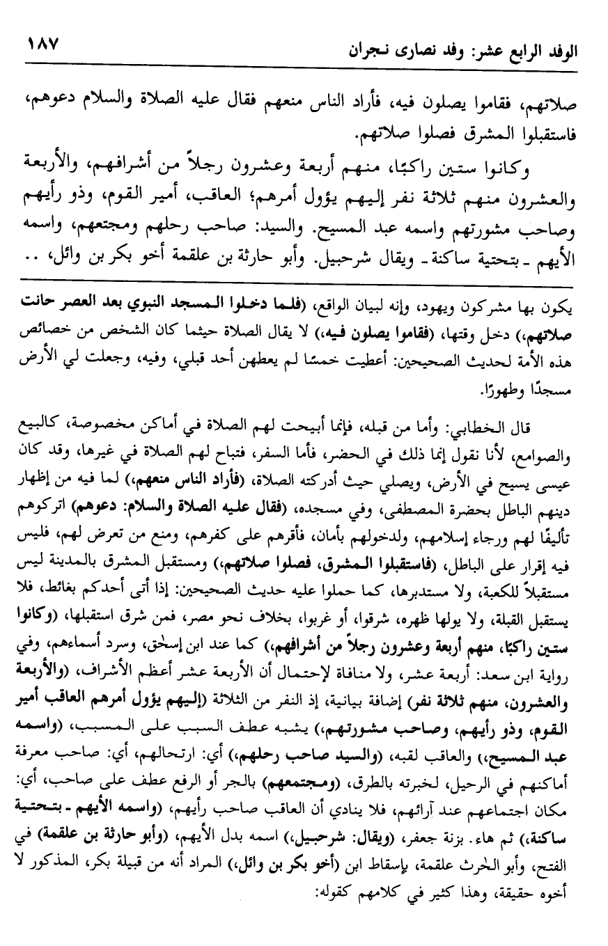 قال الخطابي: وأما من قبله، فإنما أبيحت لهم الصلاة في أماكن مخصوصة، كالبيع والصوامع؛ لأنا نقول إنما ذلك في الحضر، فأمَّا السفر، فتباح لهم الصلاة في غيرها، وقد كان عيسى يسيح في الأرض، ويصلي حيث أدركته الصلاة، "فأراد الناس منعهم" لما فيه من إظهار دينهم الباطل بحضرة المصطفى، وفي مسجده، "فقال -عليه الصلاة والسلام: "دعوهم" , اتركوهم تأليفًا لهم ورجاء إسلامهم، ولدخولهم بأمان، فأقرَّهم على كفرهم، ومنع مَنْ تعرَّض لهم، فليس فيه إقرار على الباطل، "فاستقبلوا المشرق، فصلوا صلاتهم،" ومستقبل المشرق بالمدينة ليس مستقبلًا للكعبة، ولا مستدبرها، كما حملوا عليه حديث الصحيحين: "إذا أتى أحدكم بغائط فلا يستقبل القبلة ولا يولها ظهره، شرقوا أو غربوا" , بخلاف نحو مصر، فمن شَرَّق استقبلها، "وكانوا ستين راكبًا، منهم أربعة وعشرون رجلًا من إشرافهم" كما عند ابن إسحاق، وسرد أسماءهم، وفي رواية ابن سعد: أربعة عشر، ولا منافاة لاحتمال أن الأربعة عشر أعظم الأشراف، "والأربعة والعشرون، منهم ثلاثة نفر" إضافة بيانية؛ إذ النفر من الثلاثة "إليهم يئول أمرهم, العاقب أمير القوم، وذو رأيهم، وصاحب مشورتهم" يشبه عطف السبب على المسبب، "واسمه: عبد المسيح" والعاقب لقبه، "والسيد صاحب رحلهم" أي: ارتحالهم، أي: صاحب معرفة أماكنهم في الرحيل؛ لخبرته بالطرق، "ومجتمعهم" بالجر أو الرفع, عطف على صاحب، أي: مكان اجتماعهم عند آرائهم، فلا ينافي أن العاقب صاحب رأيهم، "واسمه: الأيهم -بتحتية ساكنة" ثم هاء, بزنة جعفر، "ويقال: شرحبيل" اسمه بدل الأيهم، "وأبو حارثة بن علقمة" في الفتح، وأبو الحارث علقمة، بإسقاط ابن "أخو بكر بن وائل", المراد أنه من قبيلة بكر، المذكور لا أخوه حقيقة، وهذا كثير في كلامهم كقوله: