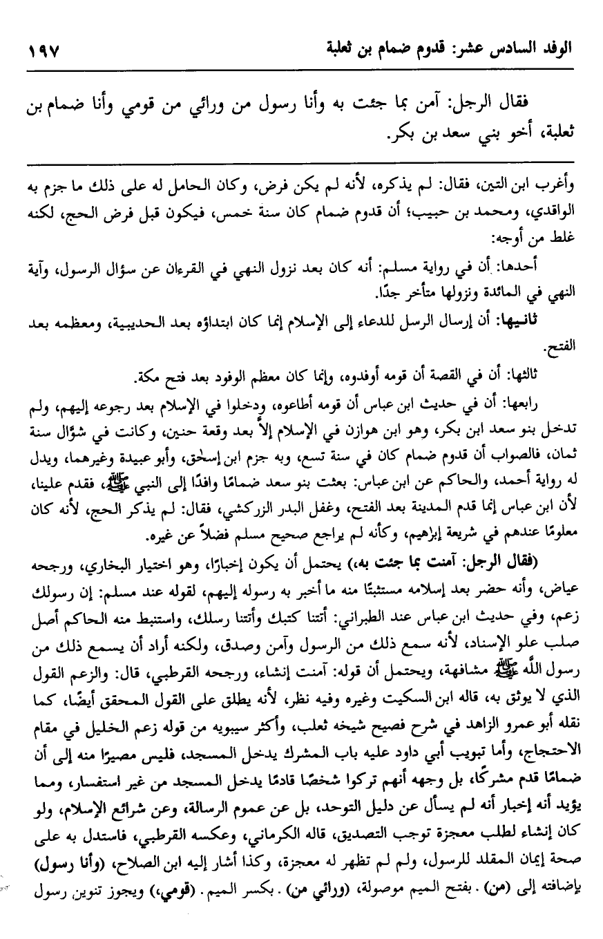 فقال الرجل: آمنت بما جئت به, وأنا رسول مَنْ ورائي من قومي, وأنا ضمام بن ثعلبة أخو بني سعد بن بكر.