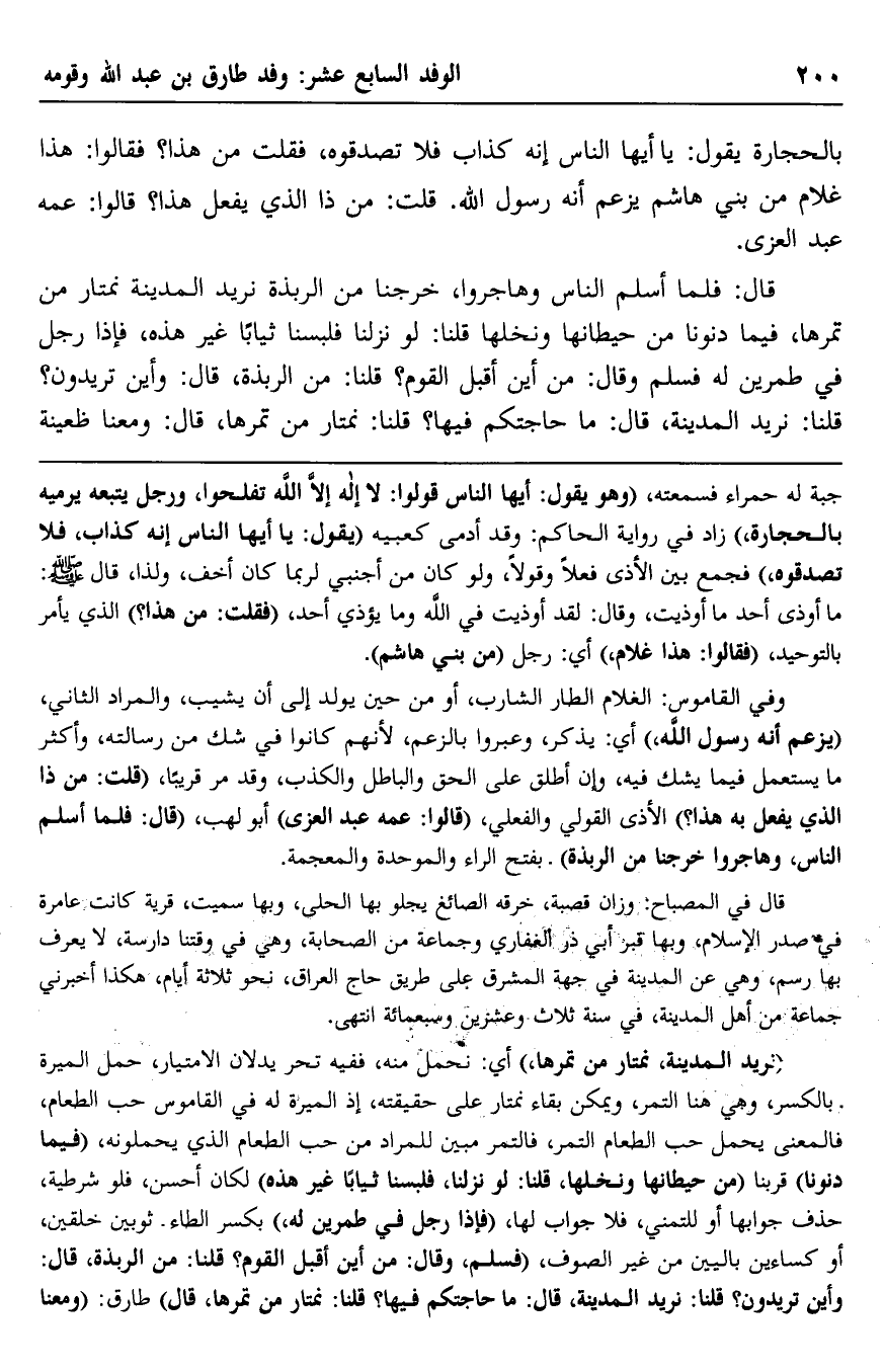قال: فيما أسلم الناس وهاجروا، خرجنا من الربذة نريد المدينة نمتار من تمرها، فلمَّا دنونا من حيطانها ونخلها قلنا: لو نزلنا فلبسنا ثيابًا غير هذه، فإذا رجل في طمرين له فسلم, وقال: من أين أقبل القوم؟ قلنا: من الربذة، قال: وأين تريدون؟ قلنا: نريد المدينة، قال: ما حاجتكم فيها؟ قلنا: نمتار من تمرها، قال: ومعنا ظعينة