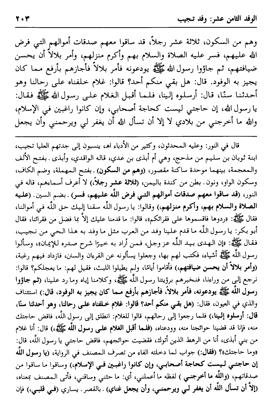 قال في النور: وعليه المحدثون، وكثير من الأدباء أ. هـ، ينسبون إلى جدتهم العليا تجيب, ابنة ثوبان بن سليم من مذحج، وهي أم أبذى بن عدي، قاله الواقدي، وأبذى -بفتح الألف والمعجمة، بينهما موحدة ساكنة مقصورة، "وهم من السكون" بفتح المهملة، وضم الكاف، وسكون الواو، ونون- بطن من كندة باليمن، "ثلاثة عشر رجلًا" لا أعرف أسماءهم، قاله في النور، "قد ساقوا معهم صدقات أموالهم التي فرض الله عليهم، فسُرَّ" بضم السين "عليه الصلاة والسلام بهم، وأكرم منزلهم" وقالوا: يا رسول الله, سقنا إليك حقّ الله في أموالنا، فقال -صلى الله عليه وسلم: "ردوها فاقسموها على فقرائكم"، قالوا: ما قدمنا عليك إلّا بما فضل من فقرائنا، فقال أبو بكر، يا رسول الله, ما قدم علينا وفد من العرب مثل ما وفد به هذا الحي من تجيب، فقال -صلى الله عليه وسلم: "إن الهدى بيد الله -عز وجل، فمن أراد به خيرًا شرح صدره للإيمان"، وسألوا رسول الله -صلى الله عليه وسلم- أشياء، فكتب لهم بها، وجعلوا يسألونه عن القرآن والسنن، فازداد فيهم رغبة، "وأمر بلالًا أن يحسن ضيافتهم،" فأقاموا أيامًا، ولم يطيلوا اللبث، فقيل لهم: ما يعجلكم؟ قالوا: نرجع إلى من وراءنا، فنخبرهم برؤيتنا رسول الله -صلى الله عليه وسلم، وكلامنا إياه وما رد علينا، "ثم جاءوا رسول الله -صلى الله عليه وسلم- يودّعونه، فأمر بلالًا، فأجازهم بأرفع مما كان يجيز به الوفود، قال", استئناف, والذي في العيون، فقال: "هل بقي منكم أحد"؟ قالوا: غلام خلَّفناه على رحالنا، وهو أحدثنا سنًّا، قال: أرسلوه إلينا،" فلما رجعوا إلى رحالهم، قالوا للغلام: انطلق إلى رسول الله، فاقض حاجتك منه، فإنا قد قضينا حوائجنا منه، وودَّعناه، "فلما أقبل الغلام على رسول الله -صلى الله عليه وسلم،" قال: أنا غلام من بني أبذى، أنا من الرهط الذين أتوك، فقضيت حوائجهم، فاقض حاجتي يا رسول الله، قال: "ما حاجتك"؟ "فقال:" جواب لما دخلته الفاء من تصرّف المصنف في الرواية، "يا رسول الله, إن حاجتي ليست كحاجة أصحابي، وإن كانوا راغبين في الإسلام،" وساقوا ما ساقوا من صدقاتهم، "والله ما أخرجني" لفظه: ما أعملني، أي: ما حثَّني وساقني، فأتى المصنف بمعناه، "إلّا أن تسأل الله أن يغفر لي ويرحمني، وأن يجعل غناي" بالقصر. يساري "في قلبي", فإن