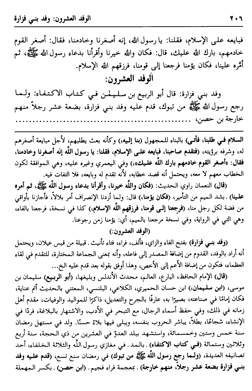 "قال" الإمام الحافظ البارع العالم، محدث الأندلس وبليغها "أبو الربيع" سليمان بن موسى "ابن سليمان،" ابن حسان الحميري، الكلاعي، البلنسي، المُعْتَنِي بالحديث أتمَّ عناية، فكان إمامًا في صناعته، بصيرًا به، عارفًا بالجرح والتعديل، ذاكرًا للمواليد والوفيات، مقدَّم أهل زمانه في ذلك، وفي حفظ أسماء الرجال، مع التبحُّر في الأدب، والاشتهار بالبلاغة، فردًا في الإنشاء، شجاعًا بطلًا، يباشر الحروب بنفسه، ويبلي فيها بلاءًَ حسنًا. ولد في مستَهَلِّ رمضان سنة خمس وستين وخمسمائة، واستُشْهِدَ ببلد العدو في العشرين من ذي الحجة، سنة أربع وثلاثين وستمائة "في كتاب الاكتفاء" بالمد, في مغازي رسول الله والثلاثة الخلفاء، أحد تصانيفه العديدة، "ولما رجع رسول الله -صلى الله عليه وسلم- من تبوك" في رمضان سنة تسع، "قدم عليه وفد بني فزارة بضعة عشر رجلًا، منهم خارجة" بمعجمة فراء فجيم "ابن حصن" بكسر المهملة