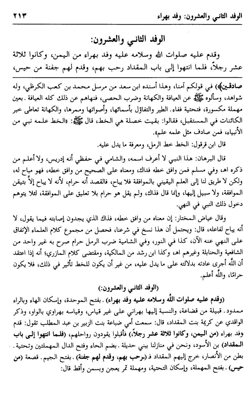 "وقدم عليه صلوات الله وسلامه عليه وفد بهراء" بفتح الموحدة، وإسكان الهاء، وبالراء ممدود- قبيلة من قضاعة، والنسبة إليها بهراني على غير قياس، وقياسه بهراوي بالواو، وذكر الواقدي عن كريمة بنت المقداد، قال: سمعت أمي ضباعة بنت الزبير بن عبد المطلب تقول: قدم وفد بهراء "من اليمن، وكانوا ثلاثة عشر رجلًا" فأقبلوا يقودون رواحلهم، "فلما انتهوا إلى باب المقداد" بن الأسود، ونحن في منازلنا ببني حديلة -بضم الحاء وفتح الدال المهملتين وتحتية- بطن من الأنصار، خرج إليهم المقداد فـ "رحَّب بهم، وقدَّم لهم جفنة" بفتح الجيم- قصعة "من حيس" بفتح المهملة، وإسكان التحتية، ومهملة, تمر يعجن بسمن وأقط, قال: