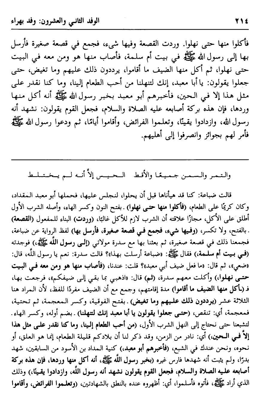 قالت ضباعة: كنا قد هيأناها قبل أن يحلوا، لنجلس عليها، فحملها أبو معبد المقداد، وكان كريمًا على الطعام، "فأكلوا منها حتى نهلوا" بفتح النون وكسر الهاء، وأصله الشرب, الأول أطلق على الأكل مجازًا علاقته أن الشرب لازم للأكل غالبًا، "وردَّت" البناء للمفعول "القصعة" بالفتح، ولا تكسر، "وفيها شيء، فجمع في قصعة صغيرة، فأرسل بها" لفظ الرواية عن ضباعة، فجمعنا ذلك في قصعة صغيرة، ثم بعثنا بها مع سدرة مولاتي "إلى رسول الله -صلى الله عليه وسلم" فوجدته "في بيت أم سلمة" فقال -صلى الله عليه وسلم: "ضباعة أرسلت بهذا"؟ قالت سدرة: نعم يا رسول الله، قال: "ضعي" , ثم قال: "ما فعل ضيف أبي معبد"؟ قلت: عندنا، "فأصاب منها هو ومن معه في البيت حتى نهلوا" وأكلت معهم سدرة، "ثم" قال: "اذهبي بما بقي إلى ضيفكم"، فرجعت بها، فـ "ـأكل منها الضيف ما أقاموا" مدة إقامتهم، وجمع مع أن الضيف مفردًا للفظ؛ لأن المراد هنا الثلاثة عشر "يرددون ذلك عليهم وما تغيض" بفتح الفوقية، وكسر المعجمة، ثم تحتية، فمعجمة، أي: تنقص، "حتى جعلوا يقولون: يا أبا معبد, إنك لتنهلنا" بضم أوله، وكسر الهاء- لتشبعنا حتى نحتاج إلى النهل الشرب الأول، "من أحب الطعام إلينا، وما كنَّا نقدر على مثل هذا إلا في الحين" أي: نادر من الزمن، وقد ذكر لنا أن بلادكم قليلة الطعام، إنما هو العلق، أو نحوه، ونحن عندك في الشبع، "فأخبرهم أبو معبد" كنية المداد بن الأسود من السابقين، شهد بدرًا، ولم يثبت أنه شهدها فارس غيره "بخبر رسول الله -صلى الله عليه وسلم، أنه أكل منها وردَّها، فإن هذه بركة أصابعه -عليه الصلاة والسلام، فجعل القوم يقولون: نشهد أنه رسول الله، وازدادوا يقينًا" وذلك الذي أراد -صلى الله عليه وسلم، فأتوه فأسلموا، أي: أظهروه عنده بالنطق بالشهادتين، "وتعلَّموا الفرائض، وأقاموا أيامًا" لم يبين عدتها، "ثم ودَّعوا رسول الله -صلى الله عليه وسلم، فأمر لهم بجوائز" لم يبيِّن أيضًا قدرها، "وانصرفوا إلى أهليهم" باليمن.