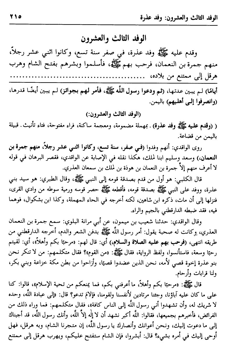 وقدم عليه -صلى الله عليه وسلم- وفد عذرة، في صفر سنة تسع، وكانوا اثني عشر رجلًا، منهم جمرة بن النعمان، فرحَّب بهم -صلى الله عليه وسلم، فأسلموا وبشَّرَهم بفتح الشام, وهرب هرقل إلى ممتنع من بلاده،