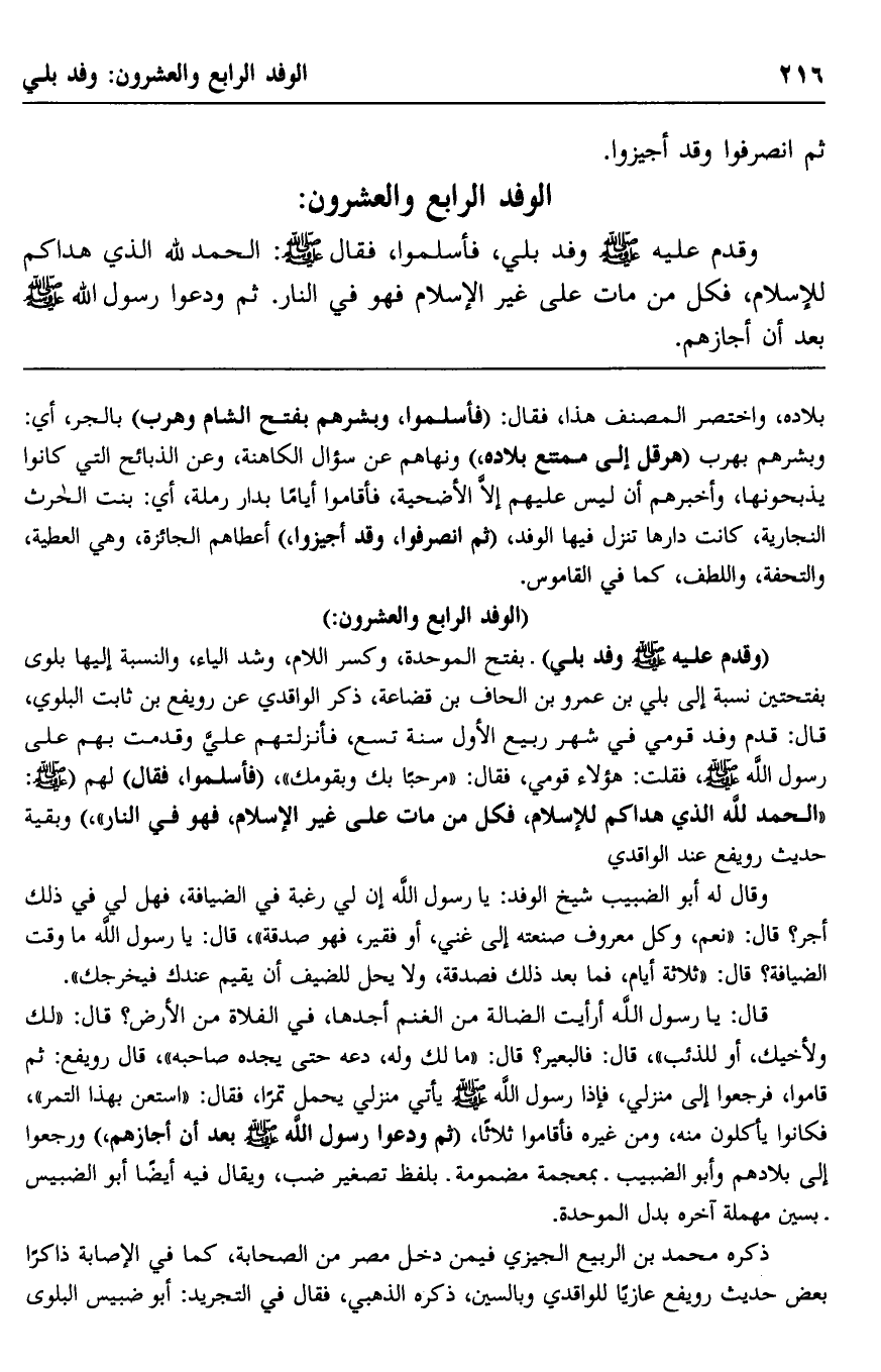وقدم عليه -صلى الله عليه وسلم- وفد بلي، فأسلموا، فقال -صلى الله عليه وسلم: "الحمد لله الذي هداكم للإسلام، فكل من مات على غير الإسلام فهو في النار" , ثم ودَّعوا رسول الله -صلى الله عليه وسلم- بعد أن أجازهم.