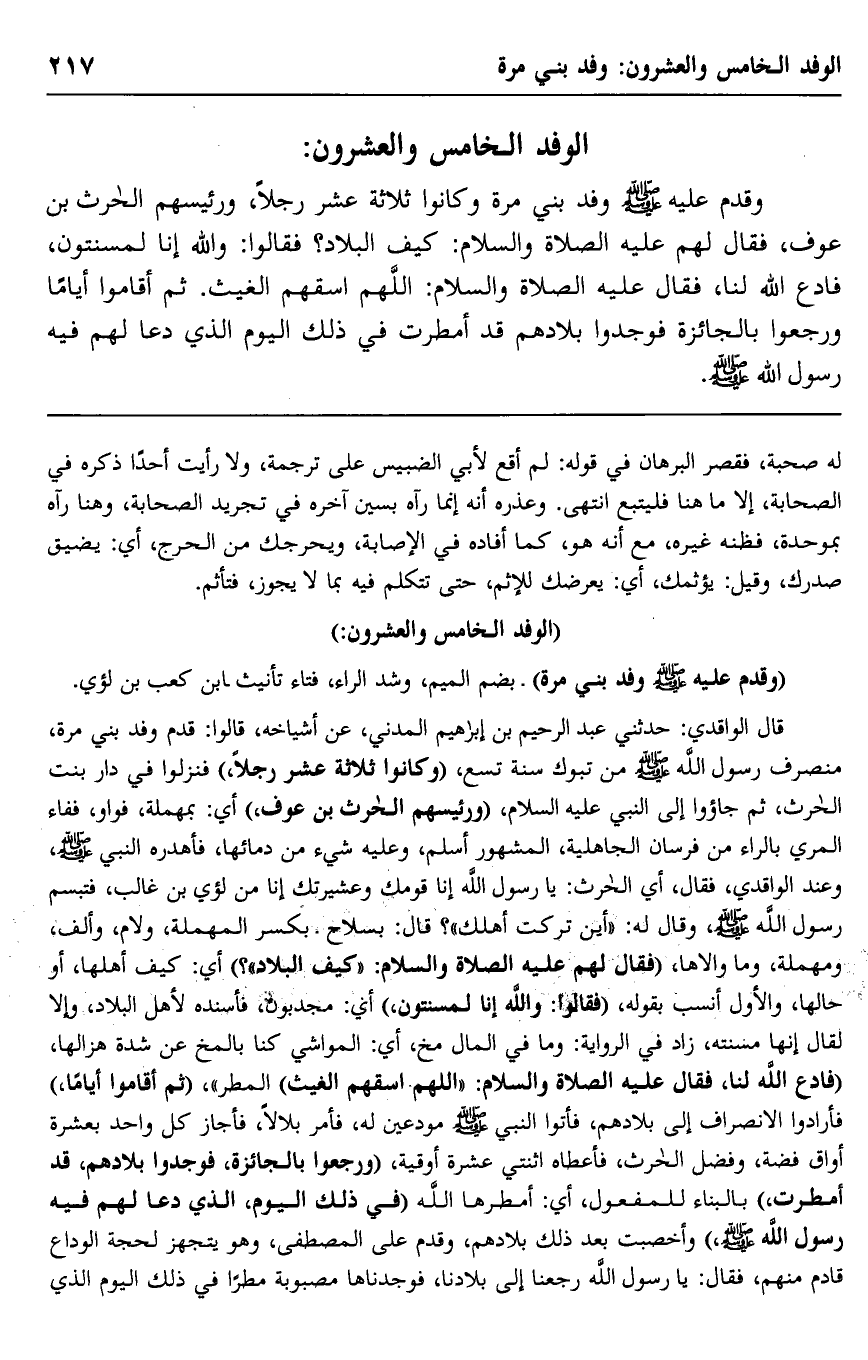 وقدم عليه -صلى الله عليه وسلم- وفد بني مرة وكانوا ثلاثة عشر رجلًا، ورئيسهم: الحارث بن عوف، فقال لهم -عليه الصلاة والسلام: "كيف البلاد"؟ فقالوا: والله إنا لمسنتون، فادع الله لنا، فقال عليه الصلاة والسلام: "اللهم اسقهم الغيث" , ثم أقاموا أيامًا ورجعوا بالجائزة, فوجدوا بلادهم قد أمطرت في ذلك اليوم الذي دعا لهم فيه رسول الله -صلى الله عليه وسلم.