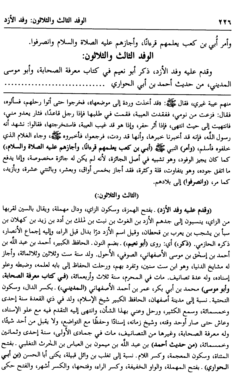 "وقدم عليه وفد الأزد" بفتح الهمزة، وسكون الزاي، ودال مهملة، ويقال بالسين لقربها من الزاي، ينسبون إلى جدهم الأزد بن الغوث بن نبت بن مالك بن أدد بن زيد بن كهلان بن سبأ بن يشجب بن يعرب بن قحطان، وقيل: اسم الأزد درًا بدال قبل الراء، وإليه إجماع الأنصار، ذكره الحازمي "ذكر" أي: روى "أبو نعيم" بضم النون- الحافظ الكبير، أحمد بن عبد الله بن أحمد بن إسحاق بن موسى الأصفهاني، الصوفي، الأحول, ولد سنة ست وثلاثين وثلاثمائة، وأجاز له مشايخ الدنيا، وهو ابن ست سنين وتفرَّد بهم، ورحلت الحفاظ إلى بابه لعلمه وضبطه وعلوّ إسناده، وله عدة تصانيف. مات في المحرم سنة ثلاث وأربعمائة، "في كتاب معرفة الصحابة، وأبو موسى" محمد بن أبي بكر، عمر بن أحمد الأصفهاني "المديني" بكسر الدال، وسكون التحتية- نسبة إلى مدينة أصفهان، الحافظ الكبير شيخ الإسلام، ولد في ذي القعدة سنة إحدى وخمسمائة، وسمع الكثير، ورحل وعني بهذا الشأن، وانتهى إليه التقدم فيه مع علوّ الإسناد، وعاش حتى صار أوحد وقته، وشيخ زمانه إسنادًا وحفظًا مع التواضع، ولا يقبل من أحد شيئًا، وله معرفة الصحابة، وغيرها من التصانيف، مات في جمادى الأولى سنة إحدى وثمانين وخمسمائة، "من حديث أحمد" بن عبد الله بن ميمون بن العباس بن الحارث التغلبي -بفتح المثناة وسكون المعجمة وكسر اللام- نسبة إلى تغلب بن وائل قبيلة، يكنَّى أبا الحسن "بن أبي الحواري" بفتح المهملة والواو الخفيفة وكسر الراء وفتحها, والكسر أشهر، والفتح حُكِيَ