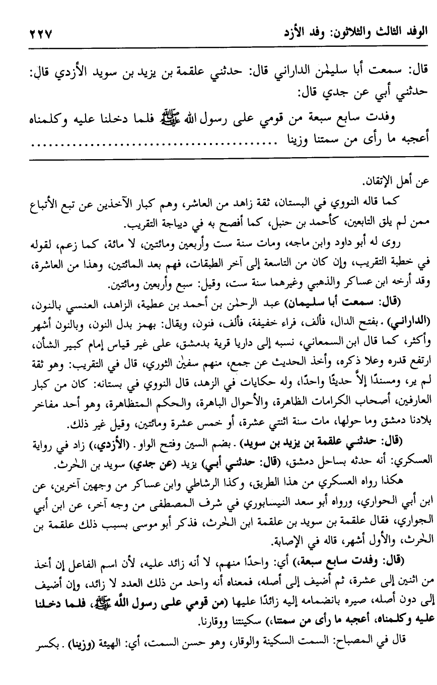 قال: سمعت أبا سليمان الداراني قال: حدثني علقمة بن يزيد بن سويد الأزدي قال: حدثني أبي عن جدي قال: وفدت سابع سبعة من قومي على رسول الله -صلى الله عليه وسلم, فلما دخلنا عليه وكلَّمْنَاه أعجبه ما رأى من سمتنا وزينا.