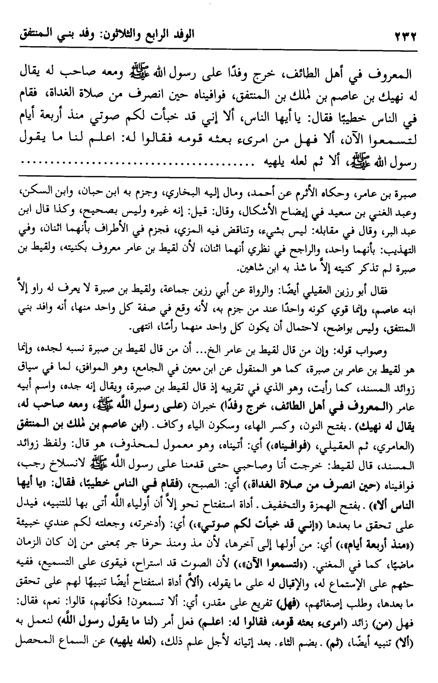 وصواب قوله: وإن من قال: لقيط بن عامر إلخ ... أن من قال لقيط بن صبرة نسبه لجده، وإنما هو لقيط بن عامر بن صبرة، كما هو المنقول عن ابن معين في الجامع، وهو الموافق لما في سياق زوائد المسند، كما رأيت، وهو الذي في تقريبه؛ إذ قال: لقيط بن صبرة، ويقال: إنه جده، واسم أبيه عامر "المعروف في أهل الطائف، خرج وفدًا" خبران "على رسول الله -صلى الله عليه وسلم، ومعه صاحب له يقال له: نهيك" بفتح النون، وكسر الهاء، وسكون الياء وكاف, "ابن عاصم بن مالك بن المنتفق" العامري، ثم العقيلي، "فوافيناه" أي: أتيناه، وهو معمول لمحذوف، هو قال: ولفظ زوائد المسند، قال لقيط: خرجت أنا وصاحبي حتى قدمنا على رسول الله -صلى الله عليه وسلم- لانسلاخ رجب، فوافيناه "حين انصرف من صلاة الغداة" أي: الصبح، "فقام في الناس خطيبًا، فقال: "يا أيها الناس, ألا" " بفتح الهمزة والتخفيف- أداة استفتاح نحو: {أَلا إِنَّ أَوْلِيَاءَ اللَّهِ} أتى بها للتنبيه، فيدل على تحقق ما بعدها, "إني قد خبَّأت لكم صوتي" أي: ادَّخرته وجعلته لكم عندي خبيئة, "منذ أربعة أيام"، أي: من أولها إلى آخرها؛ لأن مذ ومنذ حرفَا جر بمعنى من, إن كان الزمان ماضيًا -كما في المغني, "لتسمعوا الآن"؛ لأن الصوت قد استراح، فيقوى على التسميع، ففيه حثهم على الاستماع له، والإقبال له على ما يقوله، "ألا" أداة استفتاح أيضًا, تنبيهًا لهم على تحقق ما بعدها، وطلب إصغائهم، "فهل" تفريع على مقدر، أي: ألا تسمعون! فكأنهم، قالوا: نعم، فقال: فهل "من" زائد "امرئ بعثه قومه، فقالوا له: اعلم" فعل أمر "لنا ما يقول رسول الله" لنعمل به, "ألا" تنبيه أيضًا، "ثم" بضم الثاء- بعد إتيانه لأجل علم ذلك، "لعله يلهيه" عن السماع المحصل