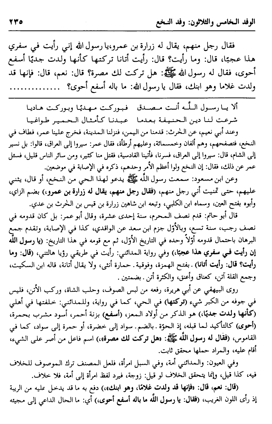 فقال رجل منهم، يقال له: زرارة بن عمرو، يا رسول الله, إني رأيت في سفري هذا عجبًا، قال: "وما رأيت"؟ قال: رأيت أتانًا تركتها كأنها ولدت جديًا أسفع أحوى، فقال له رسول الله -صلى الله عليه وسلم: "هل تركت لك مصرة"؟ قال: نعم، قال: "فإنها قد ولدت غلامًا وهو ابنك"، فقال يا رسول الله: ما باله أسفع أحوى؟