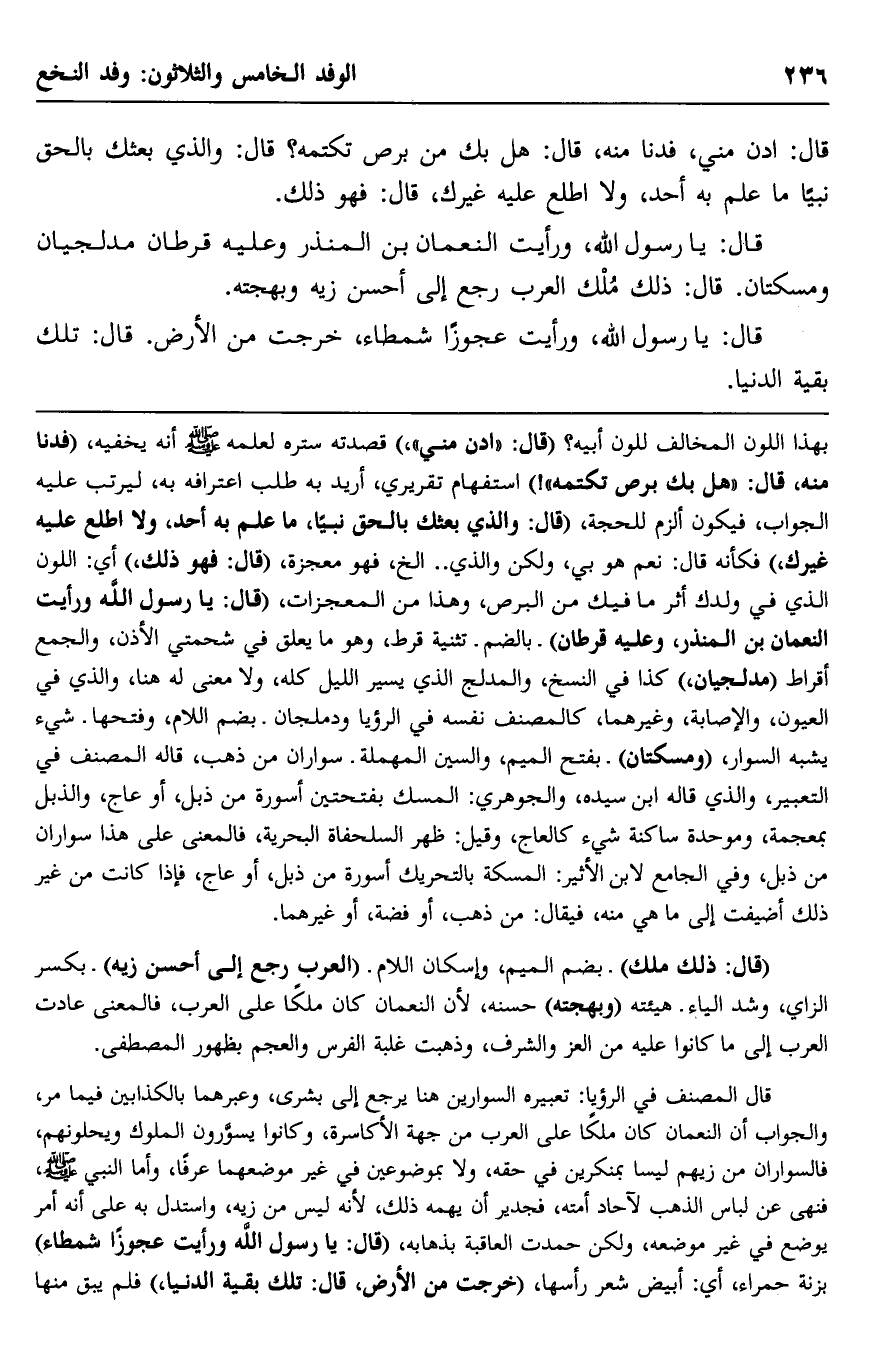 قال: يا رسول الله، ورأيت النعمان بن المنذر وعليه قرطان مدلجيان ومسكتان. قال: "ذلك ملك العرب رجع إلى أحسن زيه وبهجته".