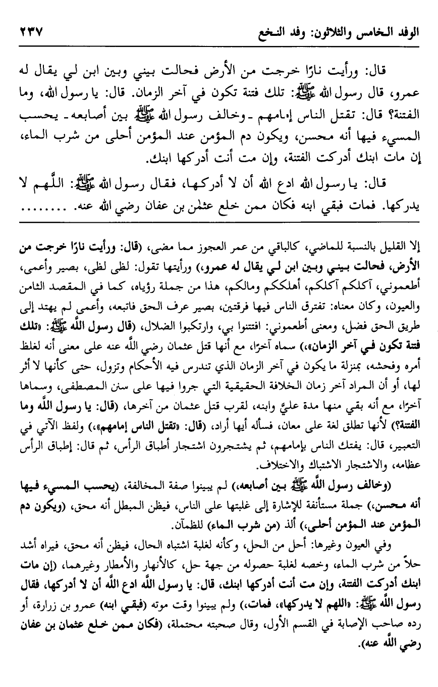 قال: ورأيت نارًا خرجت من الأرض, فحالت بيني وبين ابن لي يقال له عمرو، قال رسول الله -صلى الله عليه وسلم: "تلك فتنة تكون في آخر الزمان" , قال: يا رسول الله، وما الفتنة؟ قال: "تقتل الناس إمامهم" وخالف رسول الله -صلى الله عليه وسلم- بين أصابعه, "يحسب المسيء فيها أنه محسن، ويكنّ دم المؤمن عند المؤمن أحلى من شرب الماء، إن مات ابنك أدركت الفتنة، وإن مت أنت أدركها ابنك".
