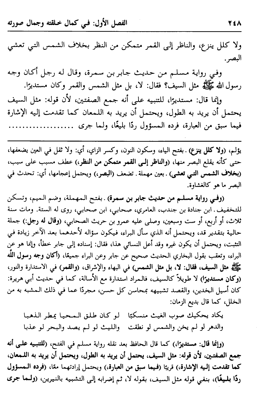 وفي رواية مسلم من حديث جابر بن سمرة، وقال له رجل: أكان وجه رسول الله -صلى الله عليه وسلم- مثل السيف؟ فقال: لا، بل مثل الشمس والقمر وكان مستديرًا.