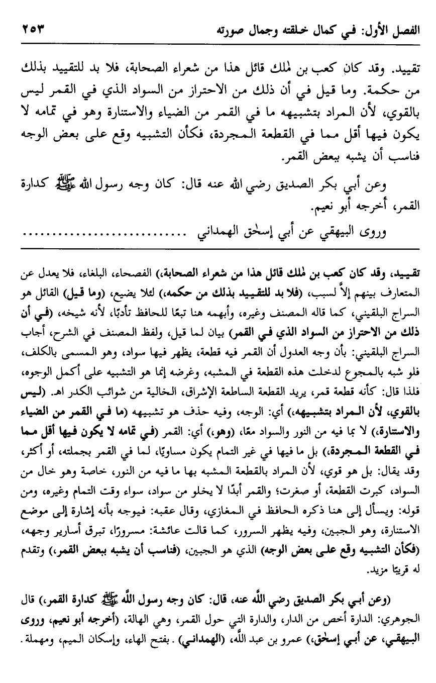 "وعلى أبي بكر الصديق -رضي الله عنه- قال: كان وجه رسول الله -صلى الله عليه وسلم- كدارة القمر"، قال الجوهري: الدارة أخصّ من الدار، والدارة التي حول القمر، وهي الهالة، "أخرجه أبو نعيم، وروى البيهقي عن أبي إسحاق"، عمرو بن عبد الله "الهمداني" بفتح الهاء، وإسكان الميم، ومهملة.