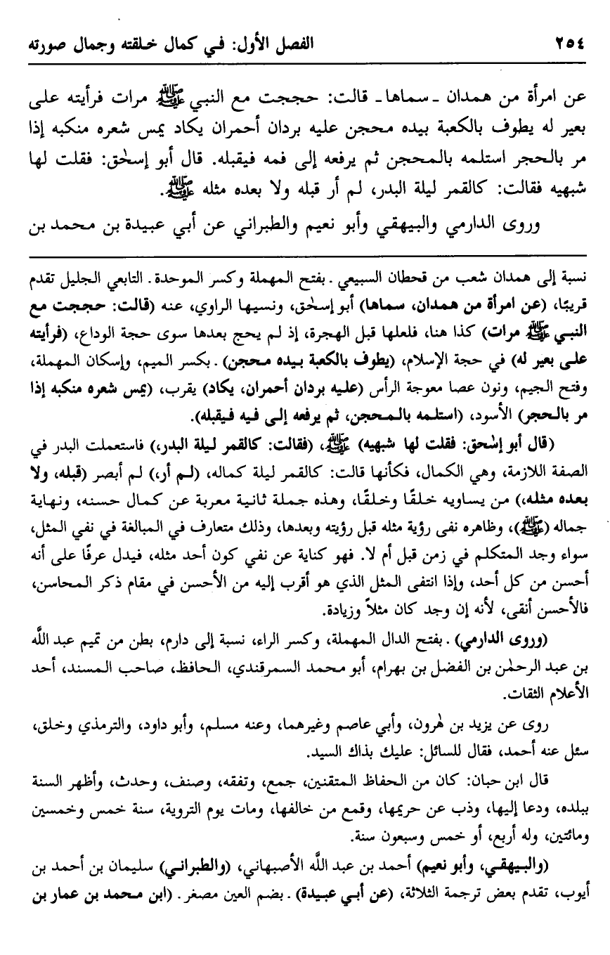 عن امرأة من همدان -سماها- قالت: حججت مع النبي -صلى الله عليه وسلم- مراتٍ, فرأيته على بعير له يطوف بالكعبة, بيده محجن, عليه بردان أحمران, يكاد يمس شعره منكبه, إذا مَرّ بالحجر استلمه بالمحجن ثم يرفعه إلى فمه فيقبّله. قال أبو إسحاق: فقلت لها شبهيه فقالت: كالقمر ليلة البدر، لم أر قبله ولا بعده مثله -صلى الله عليه وسلم.