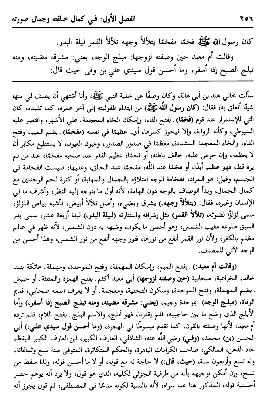 "وقالت أم معبد" بفتح الميم، وإسكان المهملة، وفتح الموحدة، ومهملة- عاتكة بنت خالد الخزاعية، صحابية "حين وصفته لزوجها" أبي معبد أكثم -بفتح الهمزة والمثلثة, أو حبيش -بضم المهملة، وفتح الموحدة، وسكون التحتية، ومعجمة- أو لا يعرف اسمه, صحابي، قديم الوفاة: "مبلج الوجه" بموحدة وجيم، "يعني: مشرقه مضيئه، ومنه: تبلج الصبح إذا أسفر"، وأما الأبلج الذي وضع ما بين حاجبيه، فلم يقترنا، فهو أبلج، والاسم البلج -بفتح اللام، فلم ترده أم معبد؛ لأنها وصفته بالقرن، كما تقدَّم مبسوطًا في الهجرة، "وما أحسن قول سيدي علي"، أبي الحسن "بن" محمد, "وفى" رضي الله عنه- الشاذلي، العارف الكبير، ابن العارف الكبير, اليقظ، حادّ الذهن، المالكي، صاحب الكرامات الباهرة، والحكم المتكاثرة، المتوفَّى سنة سبع وثمانمائة، وله تسع وأربعون سنة، "حيث قال": لا حاجة له مع قوله أولًا: ما أحسن قوله، ولذا سقط من نسخ، وإن أمكن توجيهه بأنه من ظرفية الجزئي لكليه، الذي هو قول، ولا يرد أنه يوهم حصر أحسنية قوله المذكور هنا عمَّا سواه؛ لأنه بالنسبة لكونه مدحًا في المصطفى، ثم قول يجوز أنه