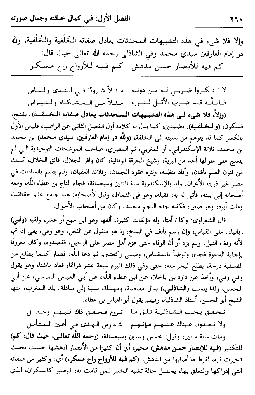 وإلّا فلا شيء في هذه التشبيهات المحدثات, يعادل صفاته الخِلْقية والخُلُقية، ولله در إمام العارفين سيدي محمد وفى الشاذلي -رحمه الله تعالى؛ حيث قال:
