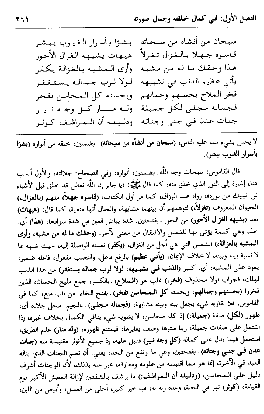 قال القاموس: سبحات وجه الله -بضمتين: أنواره، وفي الصحاح: جلالته، والأوَّل أنسب هنا، إشارة إلى النور الذي خلق منه، كما قال -صلى الله عليه وسلم: "يا جابر, إن الله تعالى قد خلق قبل الأشياء نور نبيك من نوره" رواه عبد الرزاق، كما مَرَّ أوَّل الكتاب، "قاسوه جهلًا" منهم "بالغزال"، الحيوان المعروف "تغزلًا" لتوهمهم أن بينهما مشابهة، والحال أنها منفية، كما قال: "هيهات" بعد "يشبهه الغزال الأحور" من الحور -بفتحتين: شدة بياض العين في شدة سوادها، "هذا" أي: خذ، وهي كلمة يؤتى بها للفصل والانتقال من معنى لآخر، "وحقك ما له من مشبه، وأرى المشبه بالغزالة"، الشمس التي هي أجل من الغزال، "يكفر" نعمته الواصلة إليه؛ حيث شبهه بما لا نسبة بينه وبينه، لا خلاف الإيمان، "يأتي عظيم" بالرفع فاعل، والنصب مفعول، فاعله ضمير يعود على المشبه، أي: كبير "الذنب في تشبيهه، لولا لرب جماله يستغفر" من هذا الذنب لهلك، فجواب لولا محذوف "فخرَّ" غلب هو "الملاح" بالكسر: جمع مليح, الحسان، الذين فخروا "بحسنهم وجمالهم، وبحسنه كل المحاسن تفخر" بفتح الخاء- من باب منع، كما في القاموس، فلا يقاربه شيء يجعل بينه وبين مشابهة، "فجماله مجلى" بالجيم- محل جلاء، أي: ظهور "لكل" صفة "جميلة"؛ إذ كله محاسن لا يشوبه شيء ينافي الكمال بخلاف غيره؛ إذ اشتمل على صفات جميلة، ربما سترها وصف يغايرها، فيمتنع ظهوره، "وله منار" علم الطريق، استعمل فيما يدل على كماله "كل وجه نير" دليل عليه؛ إذ جميع الأنوار مقتبسة منه "جنات عدن في جنى وَجَناته" -بفتحتين، وهي ما ارتفع من الخد، يعني: أن نعيم الجنات الذي يناله العبد في الآخرة، إنما هو مما اقتبسه من علومه ومعارفه، عبَّرَ عنه بذلك؛ لأن الوجنات أشرف دليل على المحاسن، "ودليله أن المراشف": ما يرشف بالشفتين لإزالة العطش الأكبر يوم القيامة، "كوثر" نهر في الجنة، وعده ربه به، فيه خير كثير، أحلى من العسل، وأبيض من اللبن،