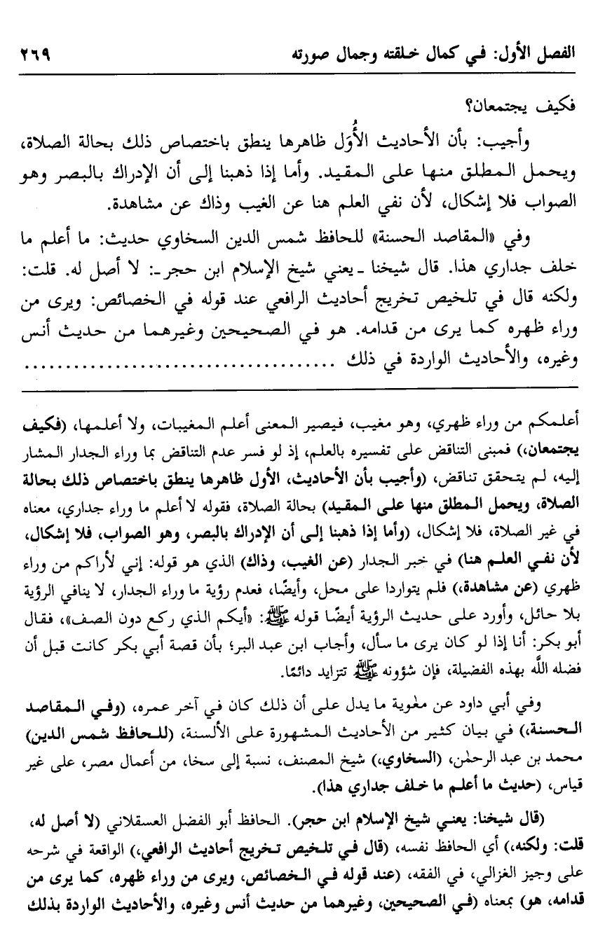وفي "المقاصد الحسنة" للحافظ شمس الدين السخاوي حديث: "ما أعلم ما خلف جداري هذا". قال شيخنا -يعني شيخ الإسلام ابن حجر: لا أصل له. قلت: ولكنه قال في تلخيص تخريج أحاديث الرافعي عند قوله في الخصائص: ويرى من وراء ظهره كما يرى من قدامه. هو في الصحيحين وغيرهما من حديث أنس وغيره، والأحاديث الواردة في ذلك