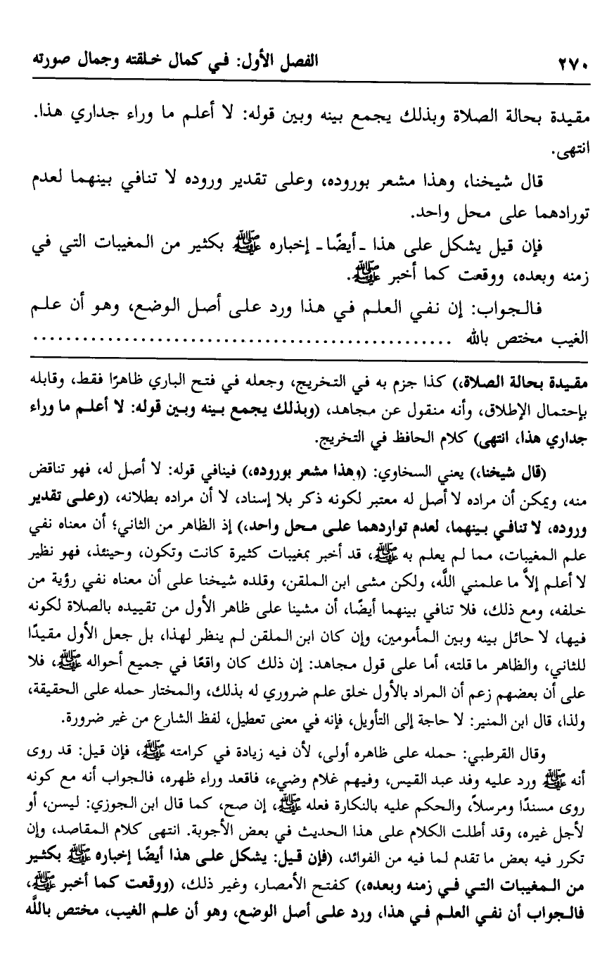 وقال القرطبي: حمله على ظاهره أَوْلَى؛ لأن فيه زيادة في كرامته -صلى الله عليه وسلم، فإن قيل: قد روي أنه -صلى الله عليه وسلم- ورد عليه وفد عبد القيس، وفيهم غلام وضيء، فأُقْعِدَ وراء ظهره، فالجواب: إنه مع كونه روي مسندًا ومرسلًا، والحكم عليه بالنكارة, فعله -صلى الله عليه وسلم، إن صح، كما قال ابن الجوزي: ليسن، أو لأجل غيره، وقد أطلت الكلام على هذا الحديث في بعض الأجوبة، انتهى كلام المقاصد، وإن تكرر فيه بعض ما تقدَّم لما فيه من الفوائد، "فإن قيل: يشكل على هذا أيضًا إخباره -صلى الله عليه وسلم- بكثير من المغيبات التي في زمنه وبعده"، كفتح الأمصار، وغير ذلك، "ووقعت كما أخبر -صلى الله عليه وسلم، فالجواب: إن نفي العلم في هذا ورد على أصل الوضع، وهو أنّ علم الغيب مختص بالله