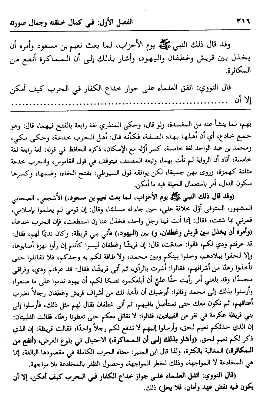 وقد قال ذلك النبي -صلى الله عليه وسلم- يوم الأحزاب، لما بعث نعيم بن مسعود, وأمره أن يخذل بين قريش وغطفان واليهود، وأشار بذلك إلى المماكرة أنفع من المكاثرة.