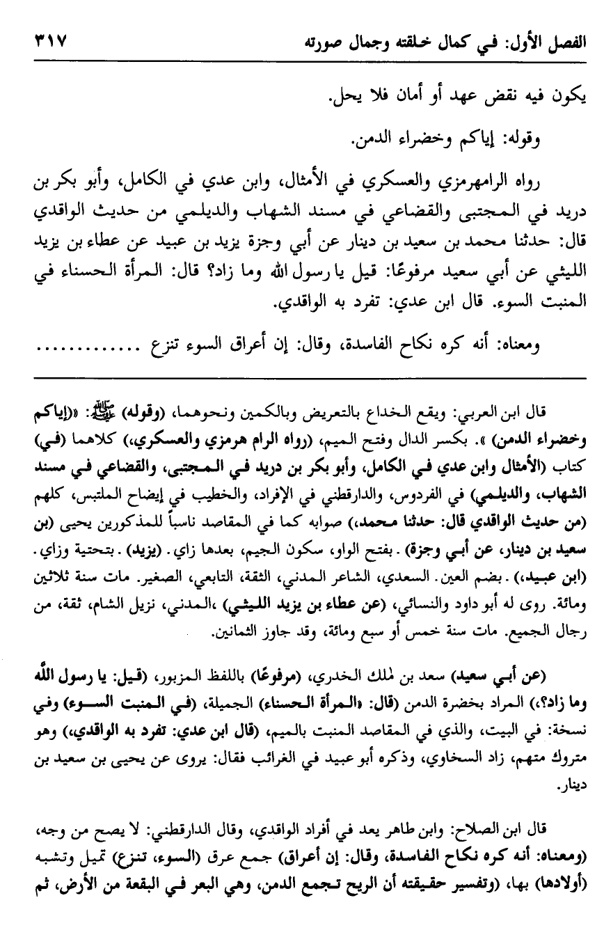 قال ابن الصلاح: وابن طاهر يُعَدّ في أفراد الواقدي، وقال الدارقطني: لا يصح من وجه، "ومعناه: إن كره نكاح الفاسدة، وقال: "إن أعراق" جمع عرق "السوء تنزع" تميل وتشبه "أولادها" بها، "وتفسير حقيقته: إن الريح تجمع الدمن، وهي البعر في البقعة من الأرض، ثم