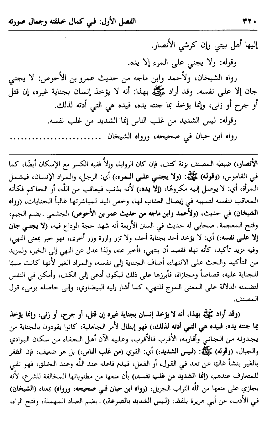 رواه الشيخان، ولأحمد وابن ماجه من حديث عمرو بن الأحوص: "لا يجني جانٍ إلا على نفسه" , وقد أراد -صلى الله عليه وسلم- بهذا: إنه لا يؤخذ إنسان بجناية غيره، إن قتل أو جرح أو زنى، وإنما يؤخذ بما جنته يده، فيده هي التي أدته لذلك.