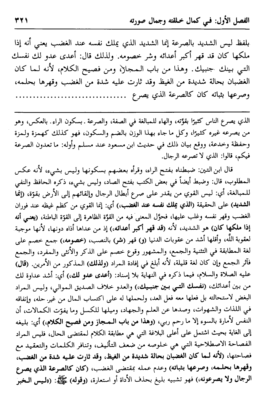 بلفظ: "ليس الشديد بالصرعة, إنما الشديد الذي يملك نفسه عند الغضب" يعني: إنه إذا ملكها كان قد قهر أكبر أعدائه وشر خصومه. ولذلك قال: أعدى عدو لك نفسك التي بين جنبيك. وهذا من باب المجاز، ومن فصيح الكلام؛ لأنه لما كان الغضبان بحالة شديدة من الغيظ وقد ثارت عليه شدة من الغضب وقهرها بحلمه، وصرعها بثباته كان كالصرعة الذي يصر.