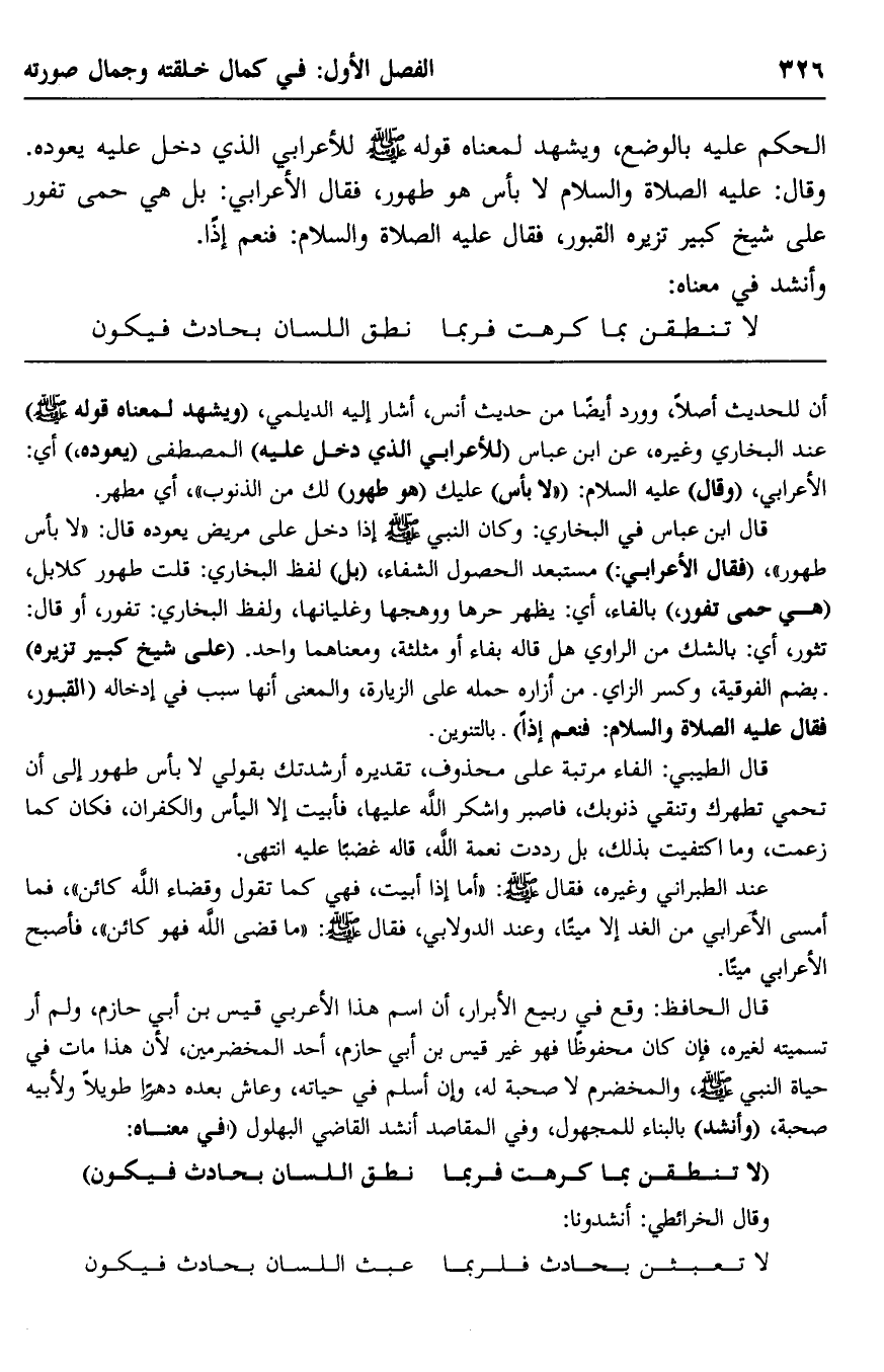 قال ابن عباس في البخاري: وكان النبي -صلى الله عليه وسلم- إذا دخل على مريض يعوده قال: "لا بأس طهور"، "فقال الأعرابي": مستبعد الحصول الشفاء، "بل لفظ البخاري: قلت طهور كلابل، "هي حمى تفور"، بالفاء، أي: يظهر حرها ووهجها وغليانها، ولفظ البخاري: تفور، أو قال: تثور، أي: بالشك من الراوي, هل قاله بفاء أو مثلثة، ومعناهما واحد. "على شيخ كبير تزيره" بضم الفوقية، وكسر الزاي- من أزاره حمله على الزيارة، والمعنى: إنها سبب في إدخاله "القبور، فقال -عليه الصلاة والسلام: "فنعم إذًا" بالتنوين.