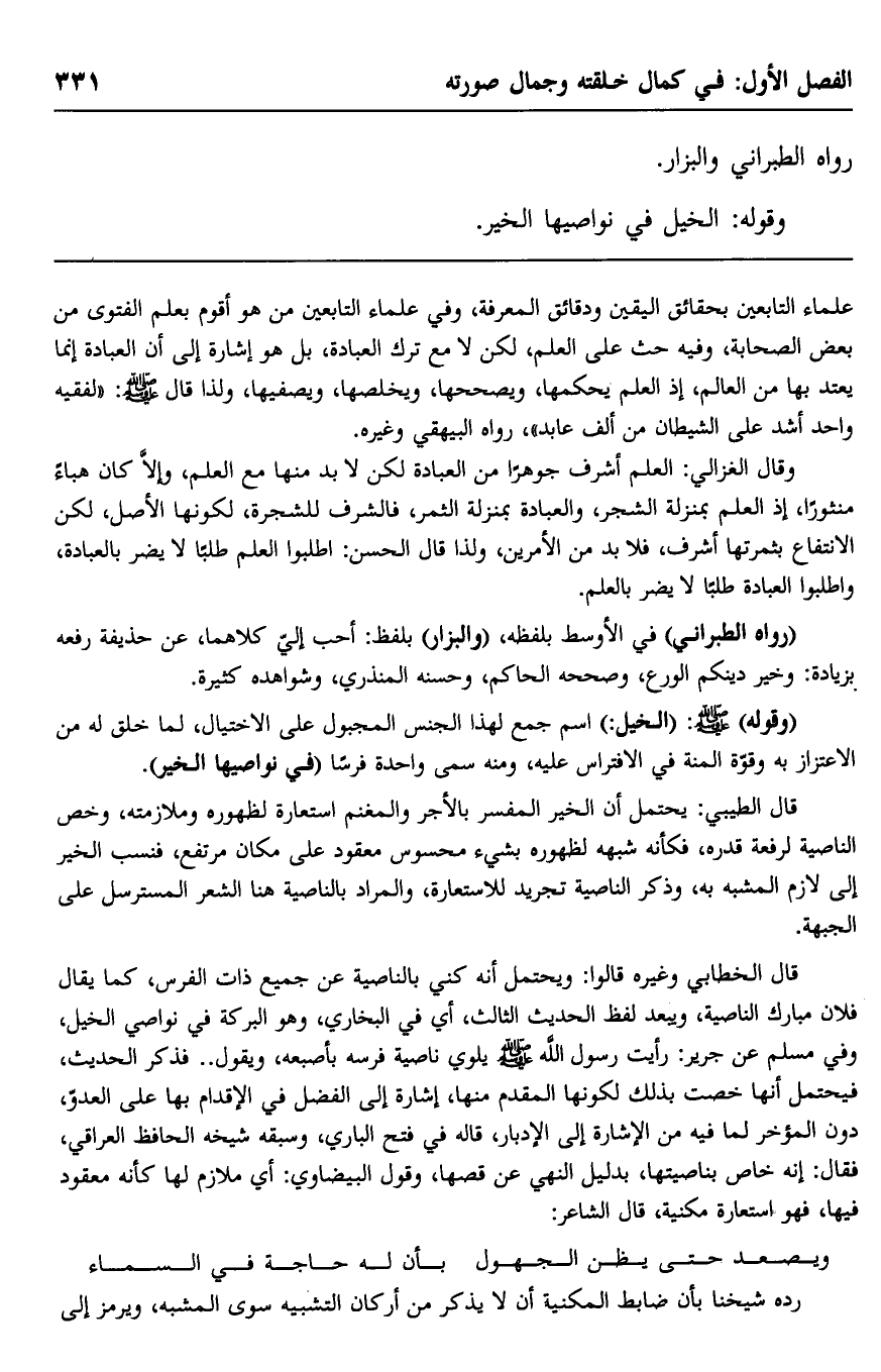 قال الخطابي وغيره قالوا: ويحتمل أنه كني بالناصية عن جميع ذات الفرس، كما يقال: فلان مبارك الناصية، ويبعد لفظ الحديث الثالث، أي: في البخاري، وهو البركة في نواصي الخيل، وفي مسلم عن جرير: رأيت رسول الله -صلى الله عليه وسلم- يلوي ناصية فرسه بأصبعه، ويقول.. فذكر الحديث، فيحتمل أنها خصت بذلك لكونها المقدم منها، إشارة إلى الفضل في الإقدام بها على العدو، دون المؤخر لما فيه من الإشارة إلى الإدبار، قاله في فتح الباري، وسبقه شيخه الحافظ العراقي، فقال: إنه خاص بناصيتها، بدليل النهي عن قصها، وقول البيضاوي: أي ملازم لها كأنه معقود فيها، فهو استعارة مكنية، قال الشاعر: