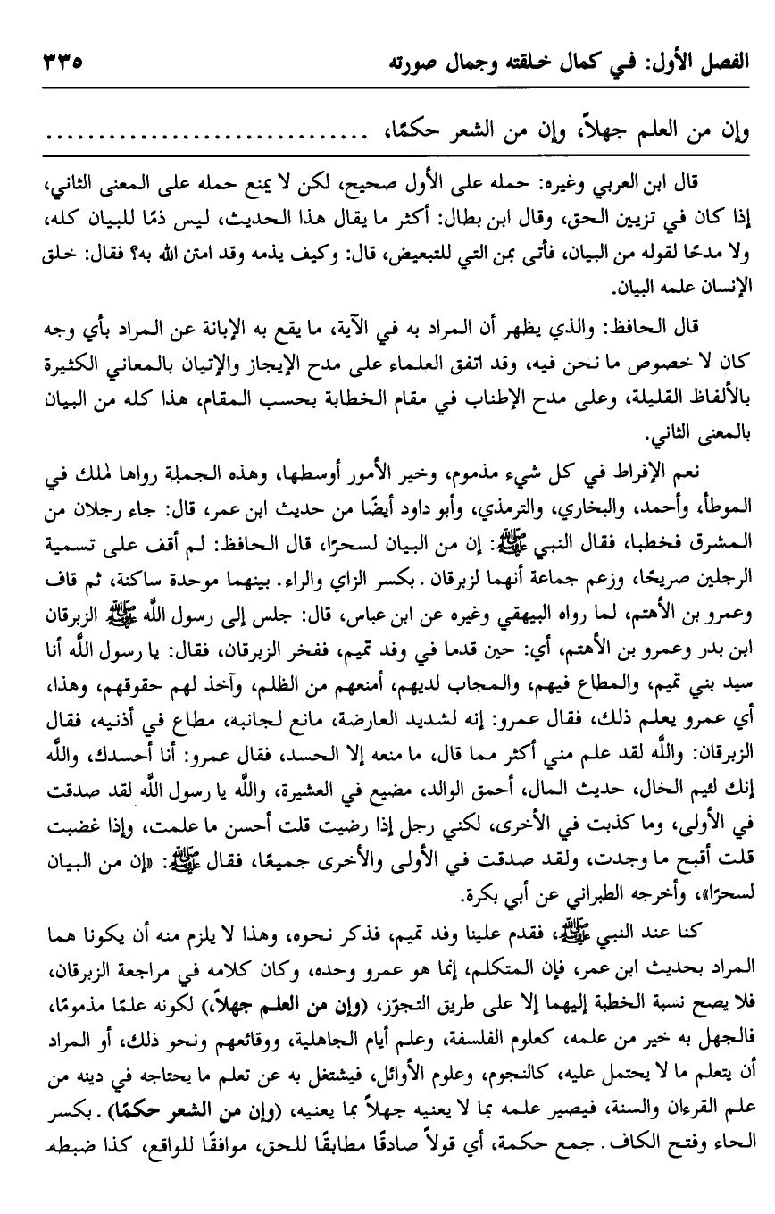 نعم الإفراط في كل شيء مذموم، وخير الأمور أوسطها، وهذه الجملة رواها مالك في الموطأ، وأحمد والبخاري، والترمذي، وأبو داود أيضًا من حديث ابن عمر، قال: جاء رجلان من المشرق فخطبا، فقال النبي -صلى الله عليه وسلم: "إن من البيان لسحرًا"، قال الحافظ: لم أقف على تسمية الرجلين صريحًا، وزعم جماعة أنهما لزبرقان -بكسر الزاي والراء بينهما موحدة ساكنة ثم قاف, وعمرو بن اأهتم، لما رواه البيهقي وغيره عن ابن عباس، قال: جلس إلى رسول الله -صلى الله عليه وسلم- الزبرقان بن بدر وعمرو بن الأهتم، أي: حين قدما في وفد تميم، ففخر الزبرقان فقال: يا رسول الله, أنا سيد بني تميم، والمطاع فيهم، والمجاب لديهم، أمنعهم من الظلم، وآخذ لهم حقوقهم، وهذا، أي: عمرو يعلم ذلك، فقال عمرو: إنه لشديد العارضة، مانع لجانبه، مطاع في أذنيه، فقال الزبرقان: والله لقد علم مني أكثر مما قال، ما منعه إلّا الحسد، فقال عمرو: أنا أحسدك، والله إنك لئيم الخال، حديث المثال، أحمق الوالد، مضيع في العشيرة، والله يا رسول الله لقد صدقت في الأولى، وما كذبت في الأخرى، لكني رجل إذا رضيت قلت أحسن ما علمت، وإذا غضبت قلت أقبح ما وجدت، ولقد صدقت في الأولى والأخرى جميعًا، فقال -صلى الله عليه وسلم: "إن من البيان لسحرًا"، وأخرجه الطبراني عن أبي بكرة.