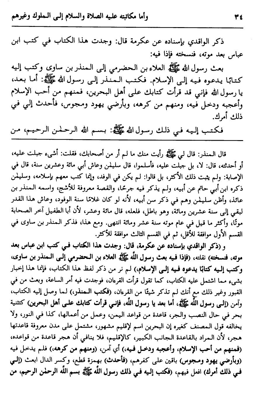 و"ذكر الواقدي بإسناده عن عكرمة، قال: وجدت هذا الكتاب في كتب ابن عباس بعد موته فنسخته" نقلته, "فإذا فيه بعث رسول الله -صلى الله عليه وسلم- العلاء بن الحضرمي إلى المنذر بن ساوى، وكتب إليه كتابًا يدعوه فيه إلى الإسلام"، لم نر من ذكر لفظ هذا الكتاب، فإنما هذا إخبار بشيء مما اشتمل عليه الكتاب، كما تقول: قرأت القرآن، فوجدت فيه أمر الساعة، وبَعْث من في القبور, وغير ذلك, مع أنك لم تذكر شيئًا من القرآن، "فكتب المنذر" لما وصل إليه الكتاب وآمن, "إلى رسول الله -صلى الله عليه وسلم: أما بعد يا رسول الله، فإني قرأت كتابك على أهل البحرين" كتثنية بحر في حال النصب والجر، قاعدة من قواعد اليمن، وعمل من أعمالها، كذا في النور، ولا يخالفه قول المصنف كغيره إن البحرين اسم لإقليم مشهور، مشتمل على مدن معروفة, قاعدتها هجر؛ لأن المراد بالقاعدة الجانب الكبير، كالإقليم، فلا ينافي أن هجر قاعدة من قواعده، "فمنهم من أحبَّ الإسلام وأعجبه ودخل فيه"، أي: آمن, "ومنهم من كرهه" فلم يدخل فيه, "وبأرضي يهود ومجوس" باقين على كفرهم، "فأحدث" بهمزة قطع وكسر الدال: ابعث "إليَّ في ذلك أمرك" أفعل فيهم، "فكتب إليه في ذلك رسول الله -صلى الله عليه وسلم: "بسم الله الرحمن الرحيم، من