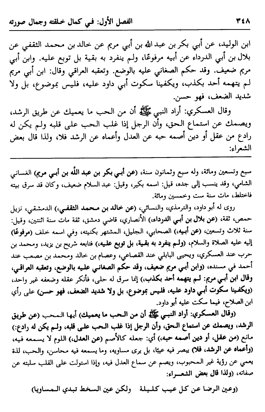روى له أبو داود، والترمذي، والنسائي، "عن خالد بن محمد الثقفي"، الدمشقي، نزيل حمص، ثقة، "عن بلال بن أبي الدرداء" الأنصاري، قاضي دمشق، ثقة, مات سنة اثنتين، وقيل: سنة ثلاث وتسعين، "عن أبيه" الصحابي الجليل المشتهر بكنيته، وفي اسمه خلف "مرفوعًا" إليه -عليه الصلاة والسلام، "ولم ينفرد به بقية، بل توبع عليه"، فتابعه شريح بن يزيد، ومحمد بن حرب عند العسكري، ويحيى البابلي عند القضاعي، وعصام بن خالد ومحمد بن مصعب عند أحمد في مسنده، "وابن أبي مريم ضعيف، وقد حكم الصغاني عليه بالوضع، وتعقَّبه العراقي، وقال ابن أبي مريم: لم يتهمه أحد بكذب"، إنما سُرِقَ له حلي، فأنكر عقله, وضعفه غير واحد، "ويكفينا سكوت أبي داود عليه، فليس بموضوع، بل ولا شديد الضعف، فهو حسن" على رأي ابن الصلاح، فيما سكت عليه أبو داود.