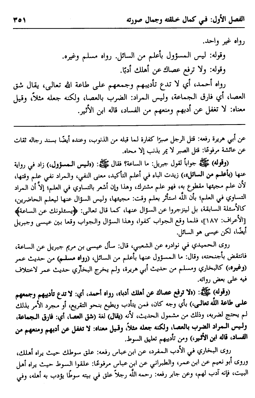 "وقوله" -صلى الله عليه ولم: "لا ترفع عصاك عن أهلك أدبًا" رواه أحمد، أي: لا تدع تأديبهم وجمعهم على طاعة الله تعالى" بأيِّ وجه كان، فمن يتأدَّب ويطيع بنحو التقريع، أو مجرد الأمر بذلك لم يحتج لضربه، وذلك من مشمول الحديث؛ لأنه "يقال" لغة "شقَّ العصا، أي: فارق الجماعة، وليس المراد الضرب بالعصا، ولكنه جعله مثلًا، وقيل معناه: لا تغفل عن أدبهم ومنعهم من الفساد، قال ابن الأثير"، ومن تأديبهم تعليق السوط.