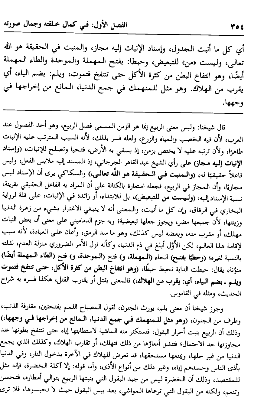 وجوّز شيخنا أن معنى يلم: الجنون، لقول المصباح: اللمم -بفتحتين- مقارفة الذنب، وطرف من الجنون، "وهو مثل للمنهمك في جمع الدنيا، المانع من إخراجها في وجهها" وذلك أن الربيع ينبت أحرار البقول، فتستكثر منه الماشية لاستطابتها إياه حتى تنتفخ بطونها عند مجاوزتها حد الاحتمال؛ فتنشق أمعاؤها من ذلك فتهلك، أو تقارب الهلاك، وكذلك الذي يجمع الدنيا من غير حلها، ويمنعها مستحقها، قد تعرض للهلاك في الآخرة بدخول النار، وفي الدنيا بأذى الناس وحسدهم إياه، وغير ذلك من أنواع الأذى، وأما قوله: "إلا آكلة الخضرة"، فإنه مَثَل للمقتصد، وذلك أنّ الخضرة ليس من جيد البقول التي ينبتها الربيع بتوالي أمطاره، فتحسن وتنعم، ولكنه من البقول التي ترعاها المواشي بعد يبس البقول؛ حيث لا تحبسوها، فلا ترى