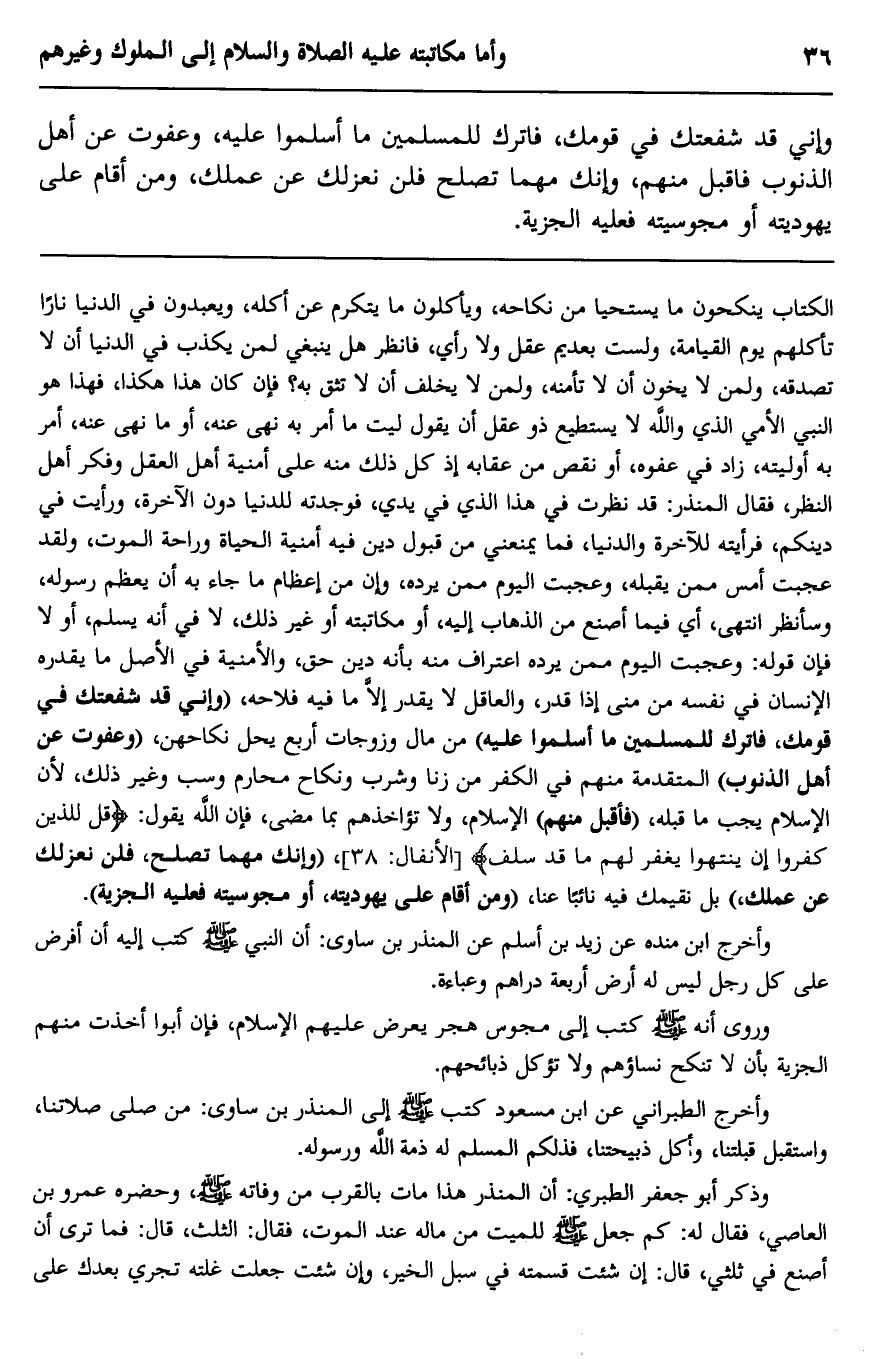 وأخرج الطبراني عن ابن مسعود, كتب -صلى الله عليه وسلم- إلى المنذر بن ساوى: "من صلى صلاتنا، واستقبل قبلتنا، وأكل ذبيحتنا، فذلكم المسلم له ذمة الله ورسوله".