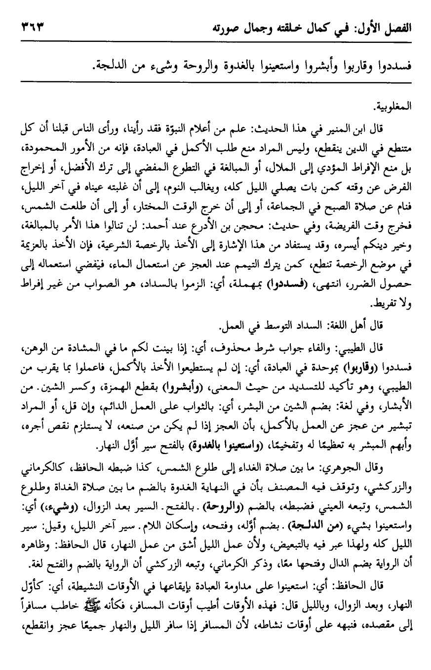 فسدِّدوا وقاربوا وأبشروا واستعينوا بالغدوة والروحة وشيء من الدلجة".