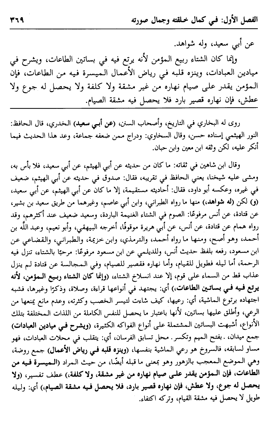 وقال ابن شاهين في ثقاته: ما كان من حديثه عن أبي الهيثم، عن أبي سعيد، فلا بأس به، ومشى عليه شيخنا، يعني: الحافظ في تقريبه، فقال: صدوق في حديثه عن أبي الهيثم، ضعيف في غيره، وعكسه أبو داود، فقال: أحاديثه مستقيمة، إلّا ما كان عن أبي الهيثم، عن أبي سعيد، "و" لكن "له شواهد"، منها ما رواه الطبراني، وابن أبي عاصم، وغيرهما, من طريق سعيد بن بشير، عن قتادة، عن أنس مرفوعًا: "الصوم في الشتاء الغنيمة الباردة"، وسعيد ضعيف عند أكثرهم، وقد رواه همّام عن قتادة، عن أنس، عن أبي هريرة موقوفًا، أخرجه البيهقي، وأبو نعيم، وعبد الله بن أحمد، وهو أصحّ، ومنها ما رواه أحمد، والترمذي، وابن خزيمة، والطبراني، والقضاعي عن ابن مسعود، رفعه بلفظ حديث أنس، وللديلمي عن ابن مسعود مرفوعًا: "مرحبًا بالشتاء، تنزل فيه الرحمة، أما ليله فطويل للقيام، وأمّا نهاره فقصير للصيام"، وفي الجالسة عن قتادة: لم ينزل عذاب قط من السماء على قوم، إلا عند انسلاخ الشتاء، "وإنما كان الشتاء ربيع المؤمن؛ لأنه يرتع فيه في بساتين الطاعات"، أي: يجتهد في أنواعها قراءة، وصلاة، وذكر وغيرها، فشبّه اجتهاده برتوع الماشية، أي: رعيها، كيف شاءت لتيسر الخصب وكثرته، وعدم مانع يمنعها من الرعي، وأطلق عليها بساتين؛ لأنها باعتبار ما يحصل للنفس الكاملة من اللذات المختلفة بتلك الأنواع، أشبهت البساتين المشتملة على أنواع الفواكه الكثيرة، "ويشرح في ميادين العبادات" جمع ميدان -بفتح الميم وتكسر- محل تسابق الفرسان، أي: يتقلّب في محلات العبادات، فهو مساوٍ لسابقه، فالسروخ هو رعي الماشية بنفسها، "وينزه قلبه في رياض الأعمال" جمع روضة، وهو الموضع المعجب بالزهور وهو بمعنى ما قبله أيضًا، من حيث المراد "الميسّرة فيه من الطاعات، فإن المؤمن يقدر على صيام نهاره من غير مشقة، ولا كلفة" عطف تفسير، "ولا يحصل له جوع ولا عطش، فإن نهاره قصير بارد، فلا يحصل فيه مشقة الصيام"، أي: وليله طويل لا يحصل فيه مشقة القيام، وتركه اكتفاء.