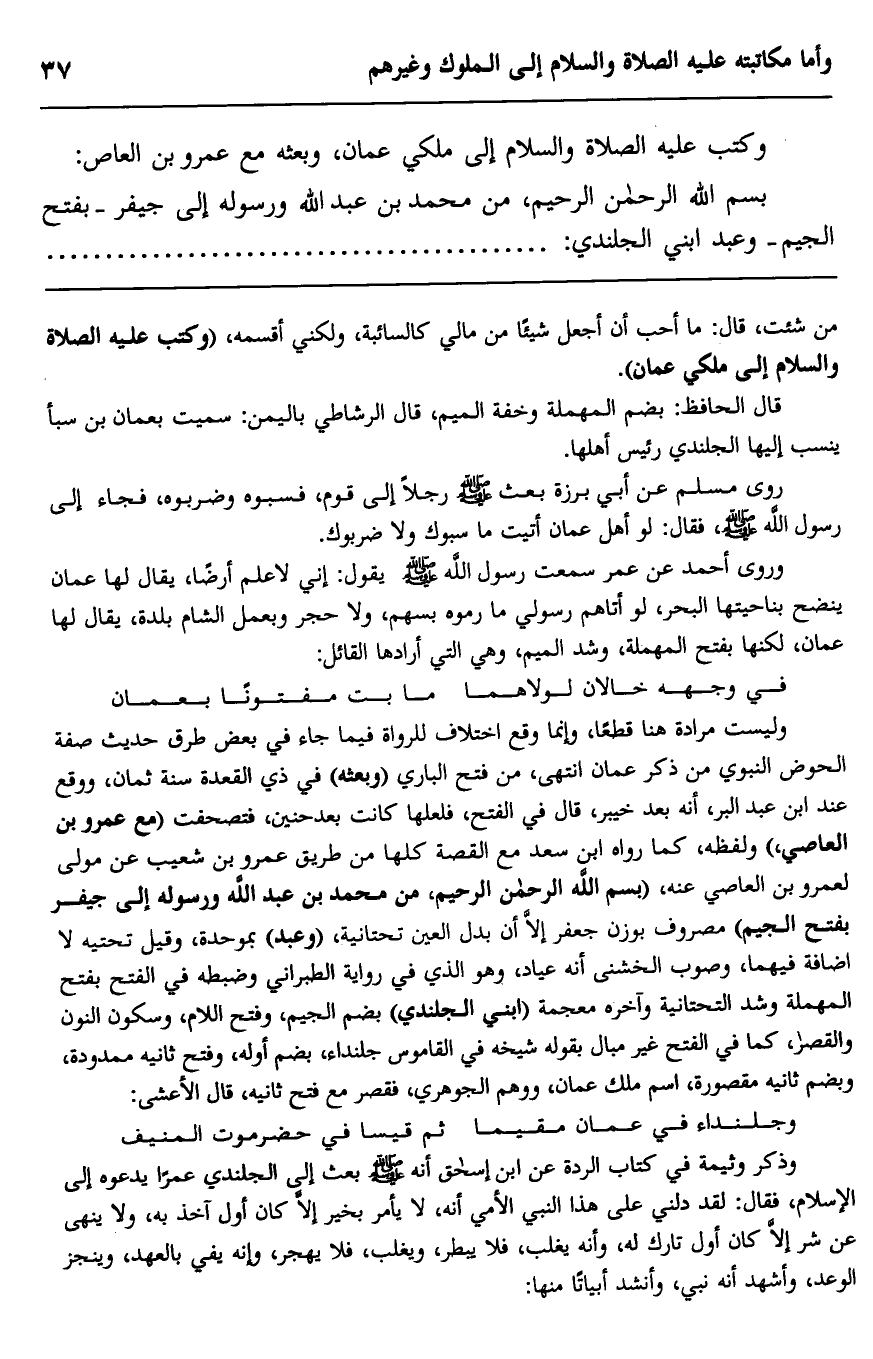 "بسم الله الرحمن الرحيم، من محمد بن عبد الله ورسوله إلى جيفر -بفتح الجيم- وعبد ابني الجلندي