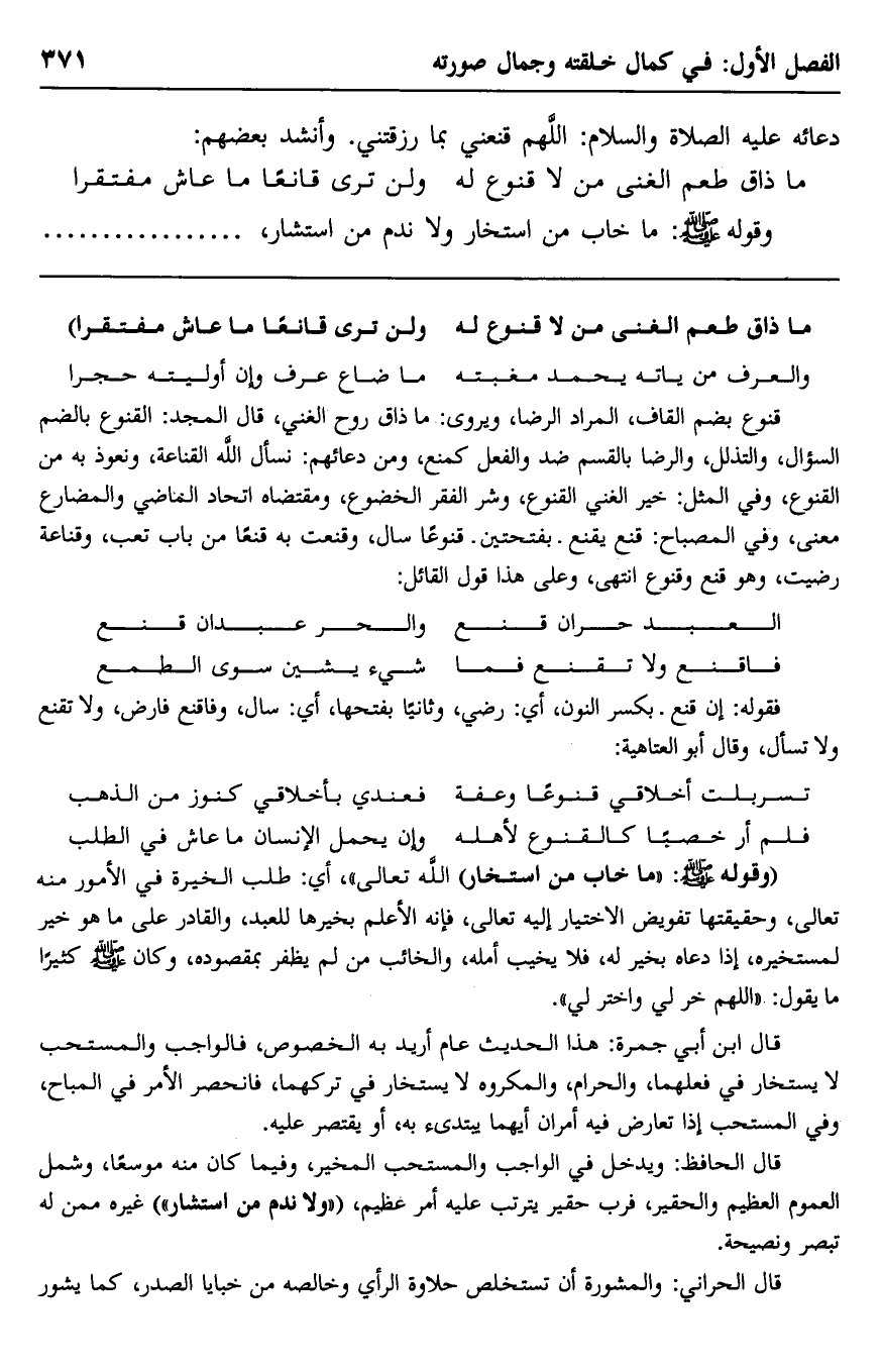 دعائه -عليه الصلاة والسلام: "اللهم قَنِّعني بما رزقتني" , وأنشد بعضهم: