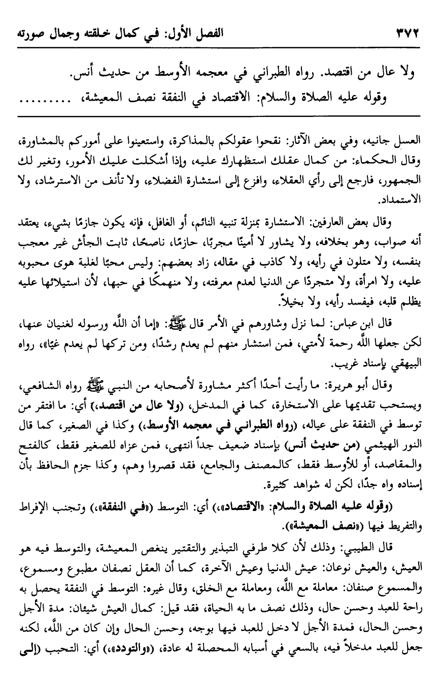 وقال أبو هريرة: ما رأيت أحدًا أكثر مشاورة لأصحابه من النبي -صلى الله عليه وسلم, رواه الشافعي، ويستحبّ تقديمها على الاستخارة، كما في المدخل، "ولا عال من اقتصد"، أي: ما افتقر من توسط في النفقة على عياله، "رواه اطبراني في معجمه الأوسط"، وكذا في الصغير، كما قال النور الهيثمي "من حديث أنس" بإسناد ضعيف جدًّا. انتهى، فمن عزاه للصغير فقط، كالفتح والمقاصد، أو للأوسط فقط، كالمصنّف والجامع، فقد قصروا وهم، وكذا جزم الحافظ بأنّ إسناده واهٍ جدًّا، لكن له شواهد كثيرة.