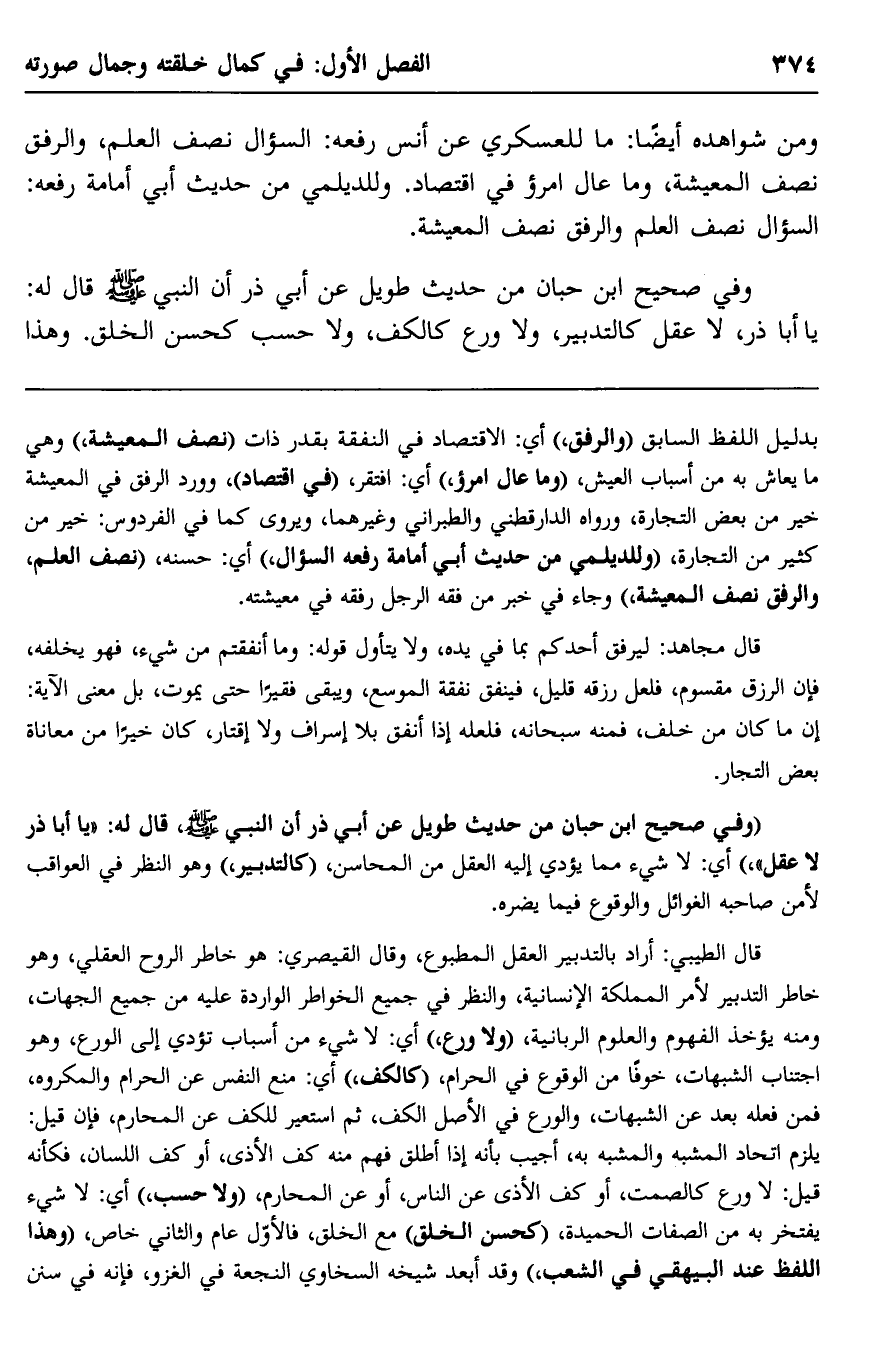 وفي صحيح ابن حِبَّان من حديث طويل عن أبي ذر, أن النبي -صلى الله عليه وسلم- قال له: "يا أبا ذر، لا عقل كالتدبير، ولا ورع كالكف، ولا حسب كحسن الخلق". وهذا