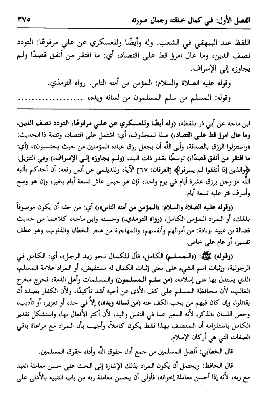 "وقوله -عليه الصلاة والسلام: "المؤمن من أمنه الناس"، أي: من حقه أن يكون موصوفًا بذلك، أو المراد: المؤمن الكامل، "رواه الترمذي"، وحسَّنه ابن ماجه، كلاهما من حديث فضالة بن عبيد بزيادة: "من أموالهم وأنفسهم، والمهاجرة من هجر الخطايا والذنوب"، وهو عطف تفسير، أو عام على خاص.