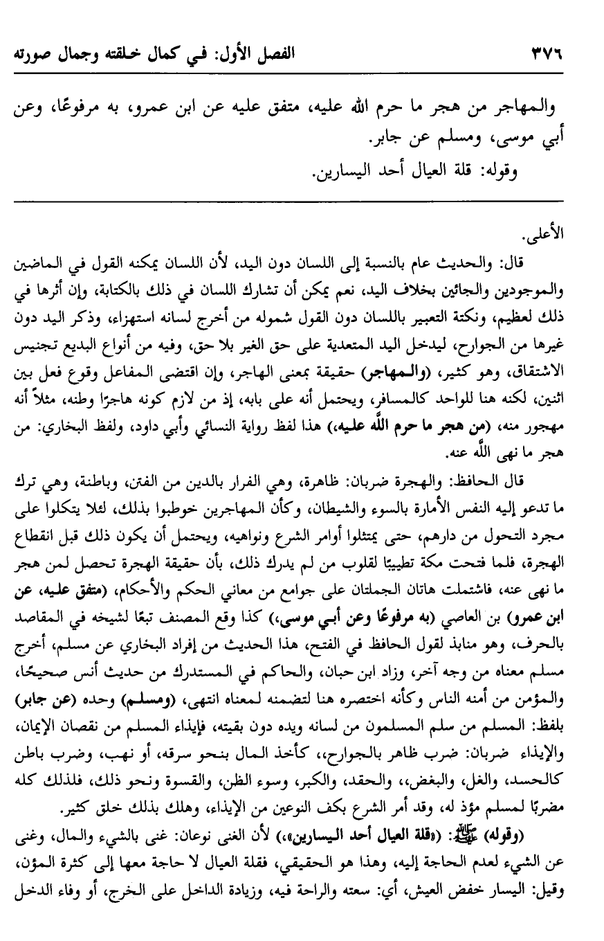 قال: والحديث عام بالنسبة إلى اللسان دون اليد؛ لأن اللسان يمكنه القول في الماضين والموجودين والجائين بخلاف اليد، نعم يمكن أن تشارك اللسان في ذلك بالكتابة، وإنّ أثرها في ذلك لعظيم، ونكتة التعبير باللسان دون القول شموله من أخرج لسانه استهزاء، وذكر اليد دون غيرها من الجوارح؛ ليدخل اليد المتعدية على حق الغير بلا حق، وفيه من أنواع البديع تجنيس الاشتقاق، وهو كثير، "والمهاجر" حقيقة بمعنى الهاجر، وإن اقتضى المفاعل وقوع فعل بين اثنين، لكنَّه هنا للواحد كالمسافر، ويحتمل أنه على بابه؛ إذ من لازم كونه هاجرًا وطنه، مثلًا أنه مهجور منه، "من هجر ما حرَّم الله عليه"، هذا لفظ رواية النسائي وأبي داود، ولفظ البخاري: "من هجر ما نهى الله عنه".