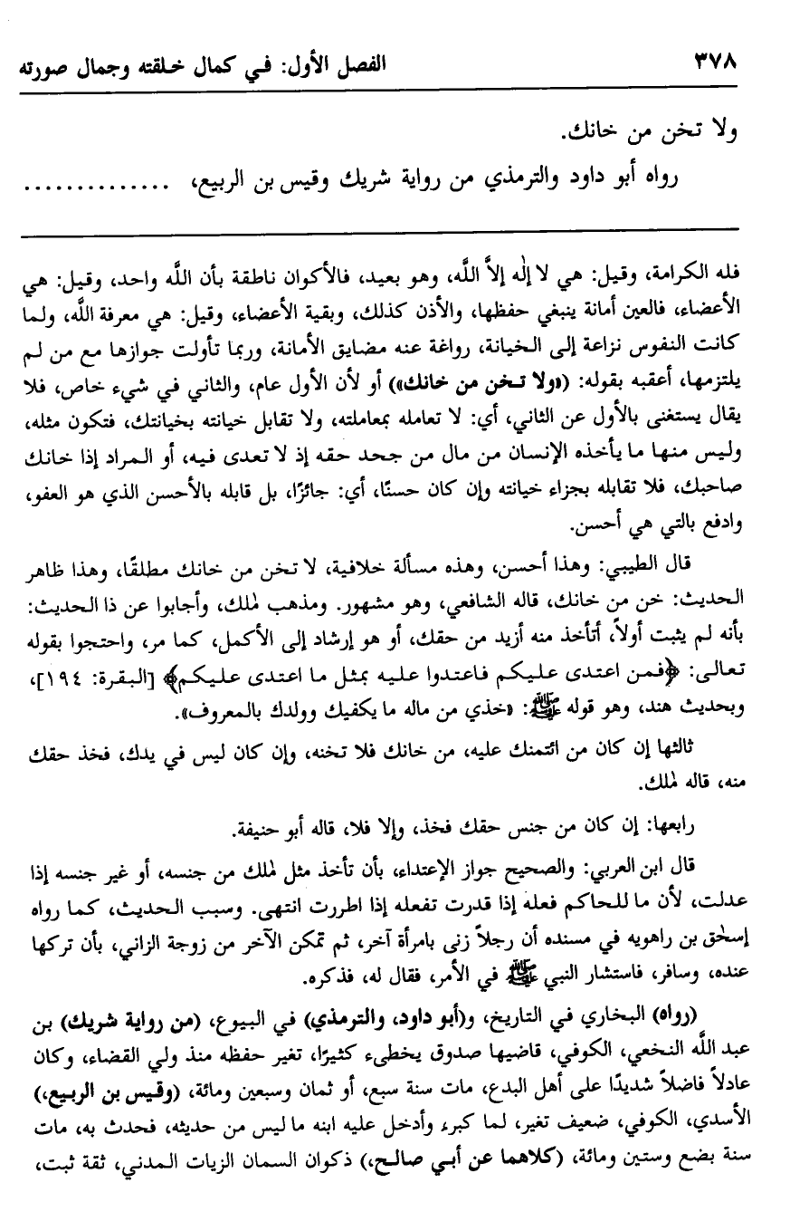قال الطيبي: وهذا أحسن، وهذه مسألة خلافية، "لا تخن من خانك مطلقًا"، وهذا ظاهر الحديث: خن من خانك، قاله الشافعي، وهو مشهور. ومذهب مالك، وأجابوا عن ذا الحديث: بأنه لم يثبت أولًا، أتأخذ منه أزيد من حقك، أو هو إرشاد إلى الأكمل، كما مَرَّ، واحتجوا بقوله تعالى: {فَمَنِ اعْتَدَى عَلَيْكُمْ فَاعْتَدُوا عَلَيْهِ بِمِثْلِ مَا اعْتَدَى عَلَيْكُمْ} [البقرة: 194] ، وبحديث هند، وهو قوله -صلى الله عليه وسلم: "خذي من ماله ما يكفيك وولدك بالمعروف".