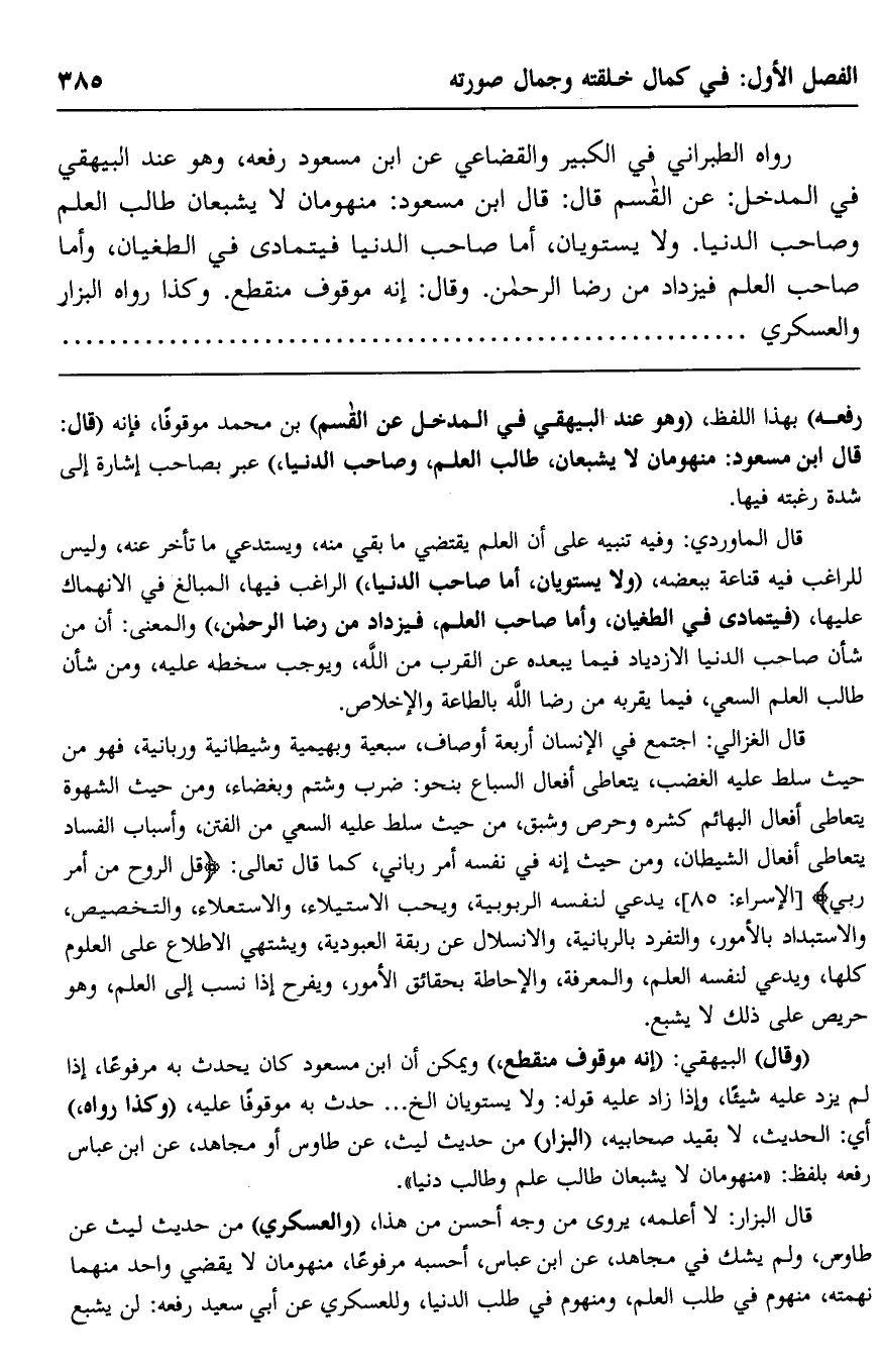 قال الماوردي: وفيه تنبيه على أنَّ العلم يقتضي ما بقي منه، ويستدعي ما تأخَّر عنه، وليس للراغب فيه قناعة ببعضه، "ولا يستويان، أمّا صاحب الدنيا" الراغب فيها، المبالغ في الانهماك عليها، "فيتمادى في الطغيان، وأما صاحب العلم: فيزداد من رضا الرحمن"، والمعنى: إن من شأن صاحب الدنيا الازدياد فيما يبعده عن القرب من الله، ويوجب سخطه عليه، ومن شأن طالب العلم السعي فيما يقربه من رضا الله بالطاعة والإخلاص.