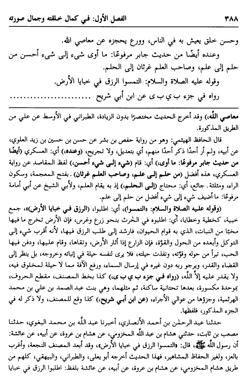 حدَّثنا عبد الرحمن بن أحمد الأنصاري، أخبرنا عبد الله بن محمد البغوي، حدَّثنا مصعب بن ثابت، حدَّثني هشام بن عبد الله المخزومي، عن هشام بن عروة، عن أبيه، عن عائشة: أنَّ رسول الله -صلى الله عليه وسلم، قال: "التمسوا الرزق في خبايا الأرض"، وقد أبعد المصنف النجعة، وأغرب بالعز، ولغير الحفّاظ المشاهير، فهذا الحديث أخرجه أبو يعلى، والطبراني، والبيهقي، كلّهم من طريق هشام المخزومي، عن هشام بن عروة، عن أبيه، عن عائشة بلفظ: "اطلبوا الرزق في خبايا