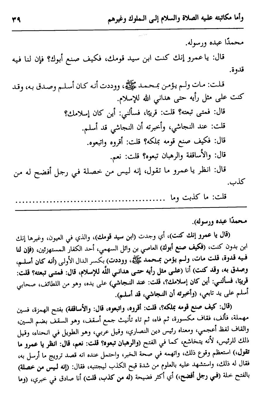 "قال: يا عمرو, إنك كنت" أي: وجدت "ابن سيد قومك"، والذي في العيون وغيرها: إنك ابن بدون كنت، "فكيف صنع أبوك" العاص بن وائل السهمي، أحد الكفار المستهزئين، "فإن لنا فيه قدوة، قلت: مات ولم يؤمن بمحمد -صلى الله عليه وسلم، ووددت" بكسر الدال الأولى "أنه كان أسلم، وصدَّق به، وقد كنت" أنا "على مثل رأيه حتى هداني الله للإسلام، قال: فمتى تبعته؟ قلت: قريبًا، فسألني: أين كان إسلامك، قلت: عند النجاشي" على يده، وهو من اللطائف، صحابي أسلم عن يد تابعي، "وأخبرته أن النجاشي قد أسلم".