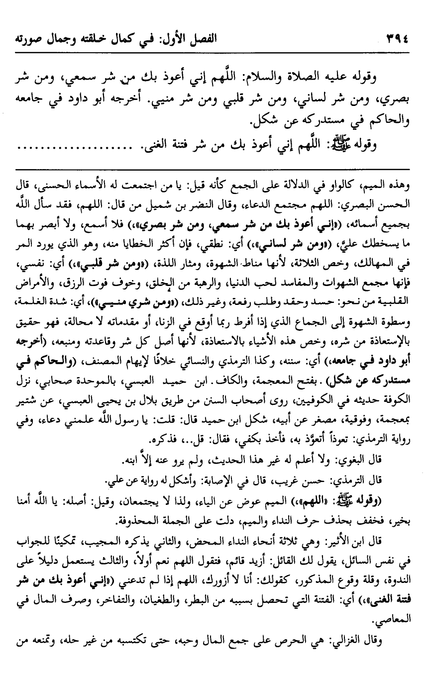وقوله -عليه الصلاة والسلام: "اللهم إني أعوذ بك من شَرِّ سمعي، ومن شَرِّ بصري، ومن شَرِّ لساني، ومن شَرِّ قلبي ومن شَرِّ مَنِيّي". أخرجه أبو داود في جامعه, والحاكم في مستدركه عن شكل.